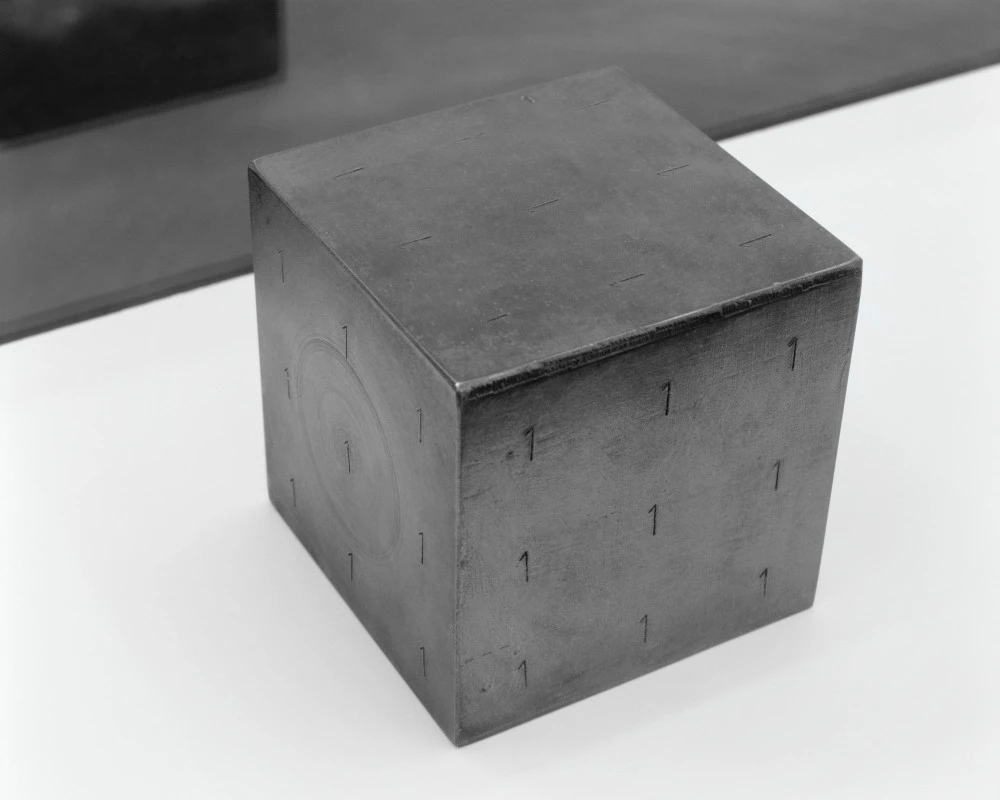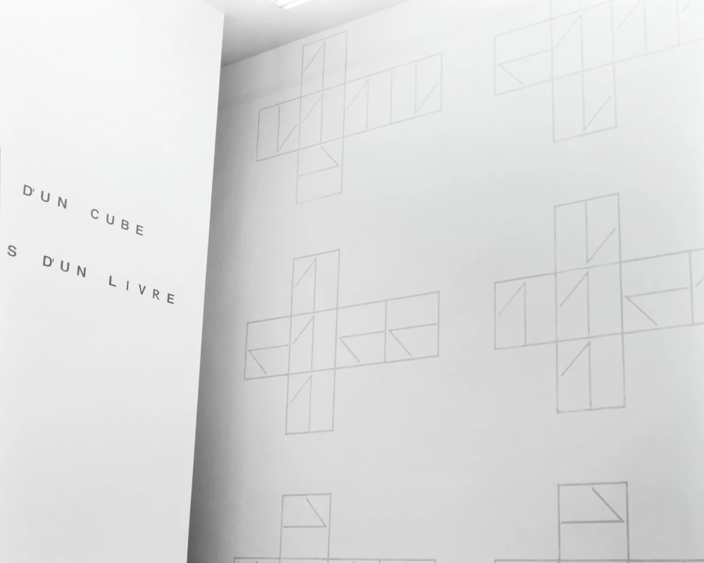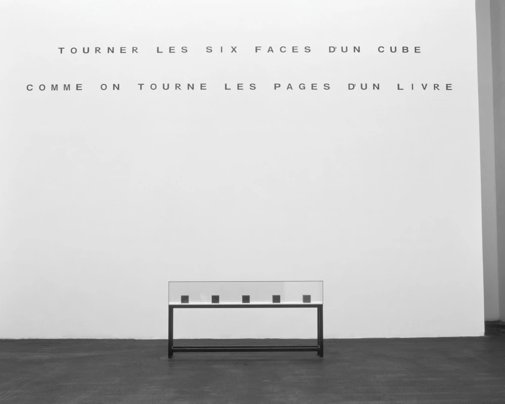 Vue de l’exposition « Ainsi de suite 1 », Crac Occitanie à Sète, 1997. Jean-Pierre Bertrand, "Tourner les six faces d’un cube…", 1997, 5 cubes acier 9x9x9 cm sous vitrine, lettrage autocollant, peinture. Production Crac Languedoc-Roussillon. Photo : François Lagarde.