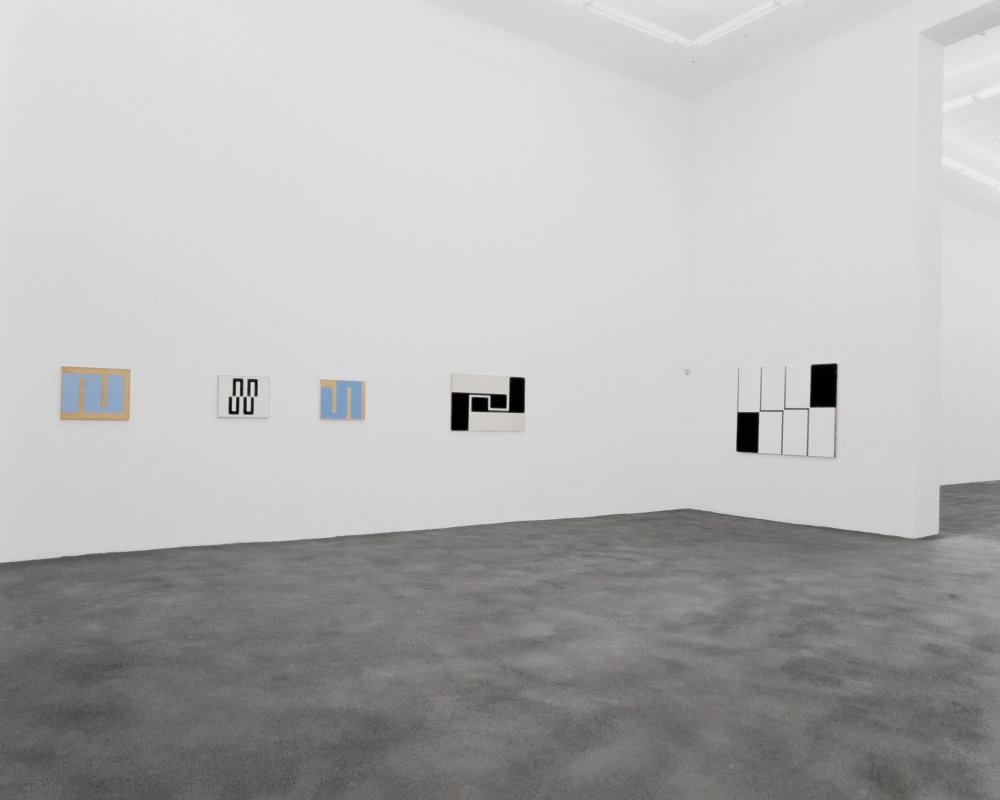 Vue de l’exposition « Ainsi de suite 1 », Crac Occitanie à Sète, 1997. De gauche à droite : Julije Knifer, "MZ 02", 1970, acrylique sur toile ; "Sans titre", 1963, acrylique sur toile ; "M 70", 1970, acrylique sur toile ; "M 16", 1964, acrylique sur toile ; "TU-HDK VI", 1975, acrylique sur toile. Photo : François Lagarde.