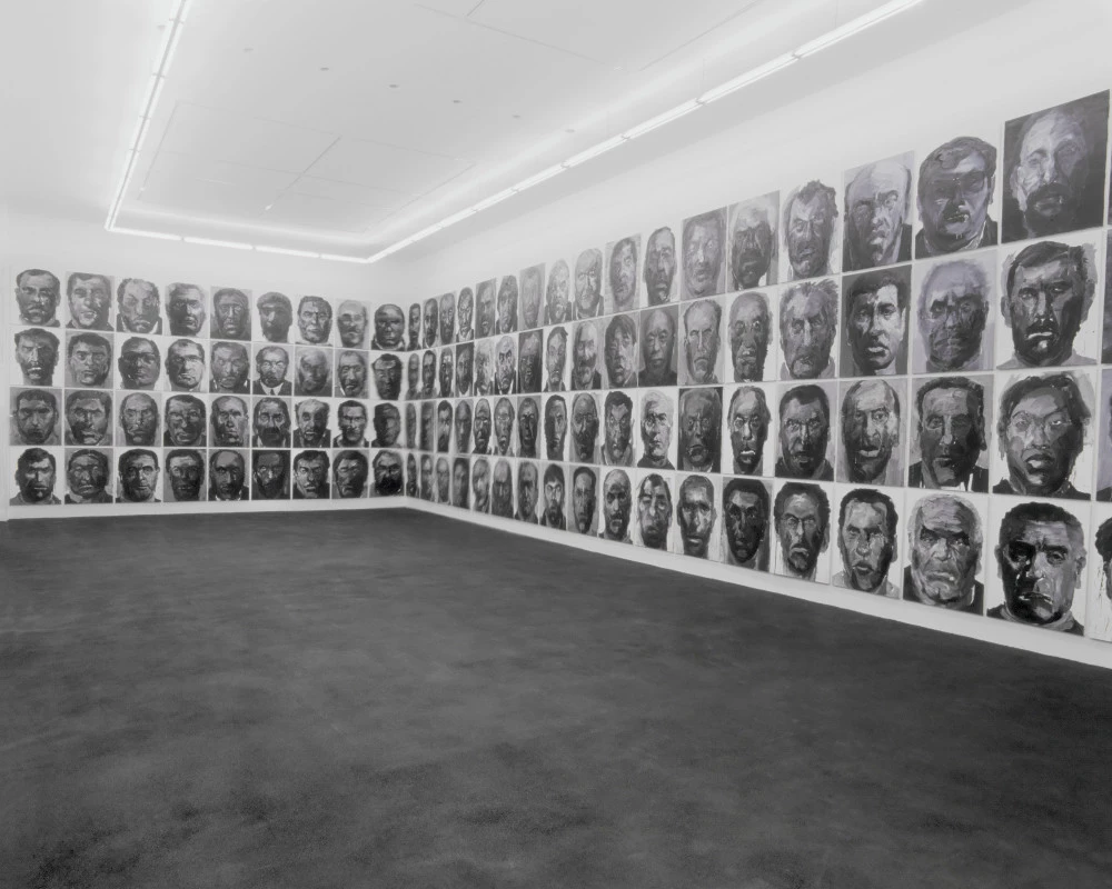 Vue de l’exposition « Ainsi de suite 1 », Crac Occitanie à Sète, 1997. Yan Pei-Ming, "108 brigands", 1994-1995, 120 toiles, 140 x 115 cm. Collection FNAC, Paris. Photo : François Lagarde.