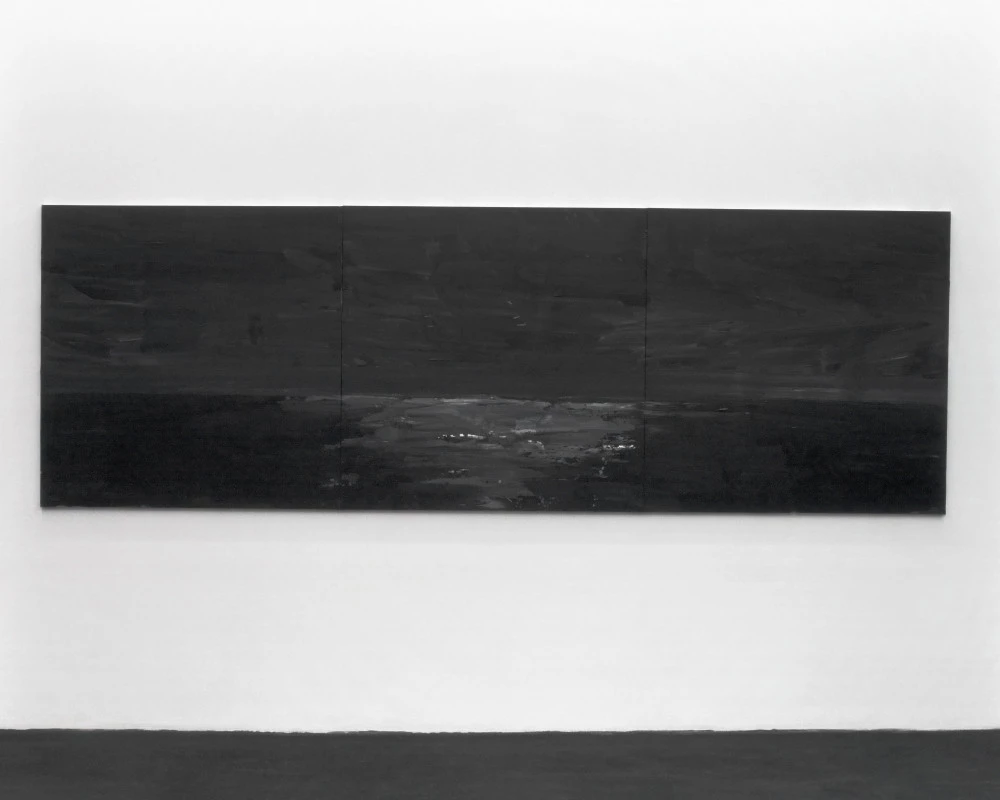 Vue de l’exposition « Ainsi de suite 1 », Crac Occitanie à Sète, 1997. Yan Pei-Ming, "Paysage", 1997, tryptique, huile sur toile, 200 x 600 cm. Production Crac Languedoc-Roussillon. Photo : François Lagarde.