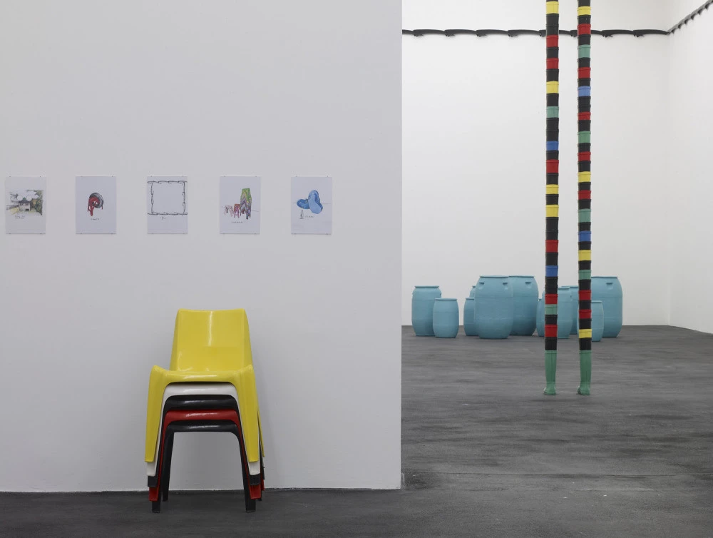 Vue de l’exposition « Aspirant l’air de la mer », Étienne Bossut, Crac Occitanie à Sète, 2009-2010. De gauche à droite, « Faux », 2009, moulage en polyester, production Crac Occitanie et « Des pots », 1995, moulage en polyester. Photo : Marc Domage.
