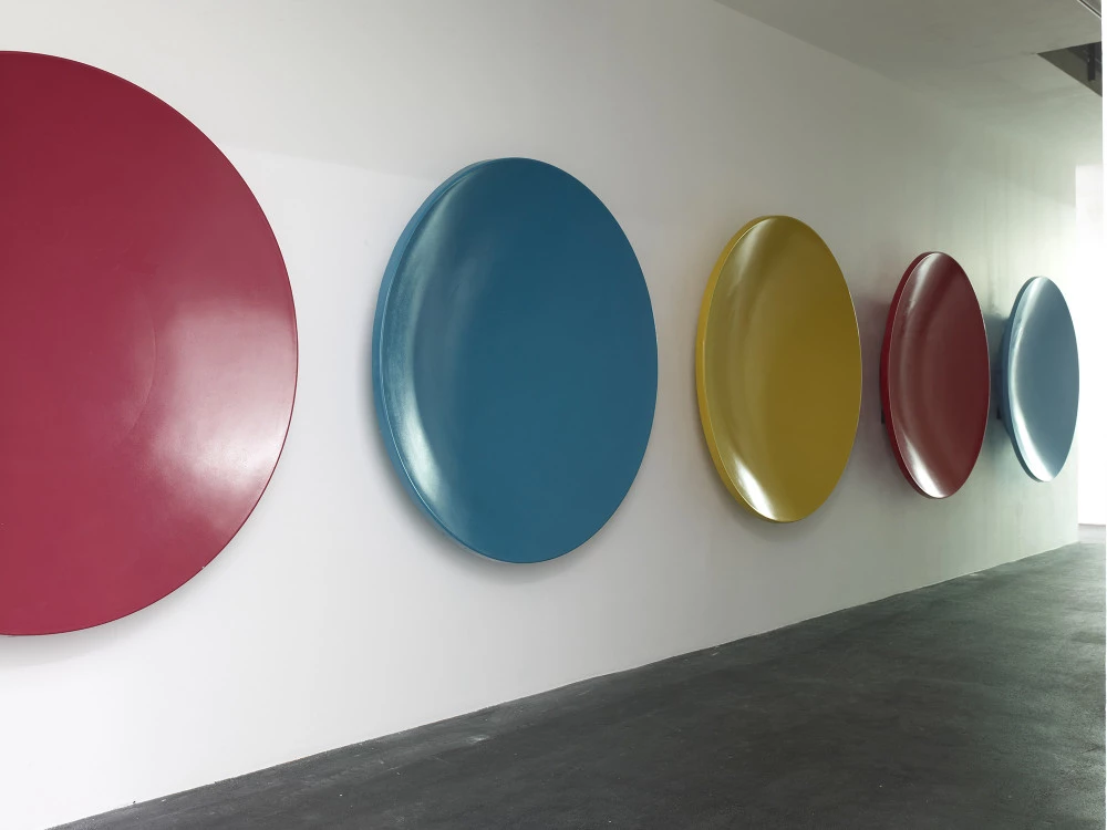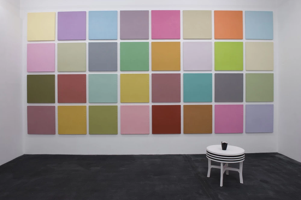 Vue de l’exposition « Aspirant l’air de la mer », Étienne Bossut, Crac Occitanie à Sète, 2009-2010. De gauche à droite, « Monochromes », 1980-2003, 32 moulages en polyester et « Sur la table », 2009, moulage en polyester, production Crac Occitanie. Photo : Marc Domage.
