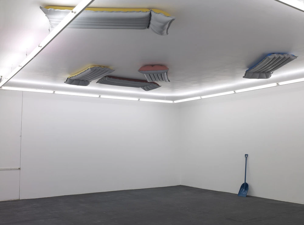 Vue de l’exposition « Aspirant l’air de la mer », Étienne Bossut, Crac Occitanie à Sète, 2009-2010. De gauche à droite, « Nuages », 2001, moulage en polyester et « La pelle », 2009, moulage en polyester, production Crac Occitanie. Photo : Marc Domage.