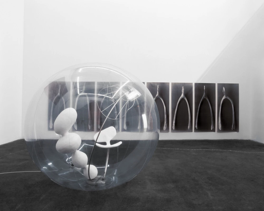 Vue de l’exposition « Cet été là… exposition de variété », Crac Occitanie à Sète, 1998. Au sol : Dorothée Golz, "Hohlwelt", 1996. Au mur : Caroline Muheim, "Wish bones", 1997. Photo : Pierre Schwartz.