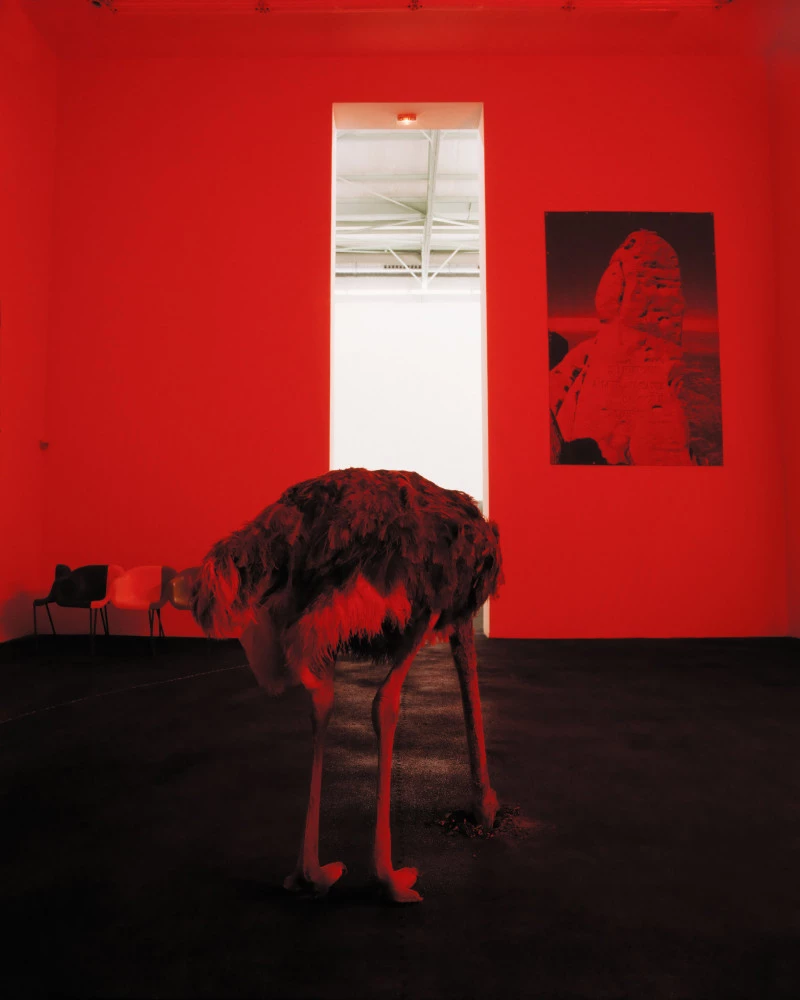 Vue de l’exposition « Cet été là… exposition de variété », Crac Occitanie à Sète, 1998. Au mur : Philippe Mayaux, "Le jocondeur, version mâle de la Joconde fragmentée", 1992. Au sol : Nick Van de Steeg, "Mobilier pour l’étage e (anarchie) de la Très Grande Administration Démocratique", 1997. Photo : Pierre Schwartz.