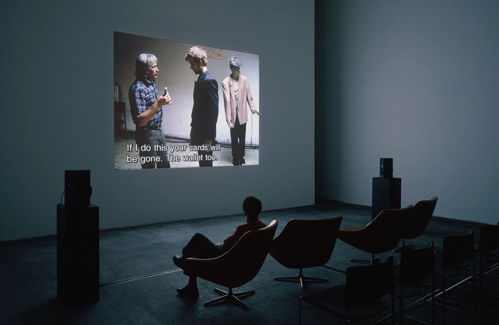Vue de l’exposition « Coconutour », Crac Languedoc-Roussillon, Sète, 2003. Sven Augustijnen, « L’école des pickpockets », 2002, vidéo en boucle, courtesy Galerie Yan Mot, Bruxelles. Photo : André Morin.
