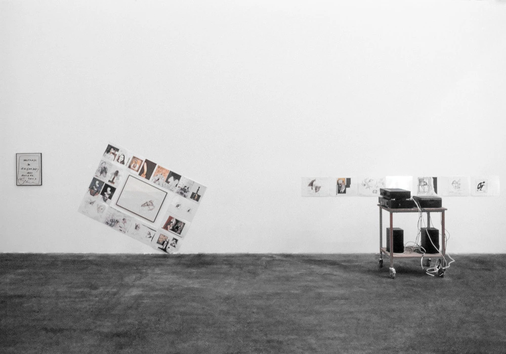 Vue de l’exposition « Coconutour », Crac Languedoc-Roussillon, Sète, 2003. Benoît Platéus, « Le mur du son », 2002, papier collé, 120 x 84 cm, courtesy Galerie Baronian Francey, Bruxelles. Photo : André Morin.