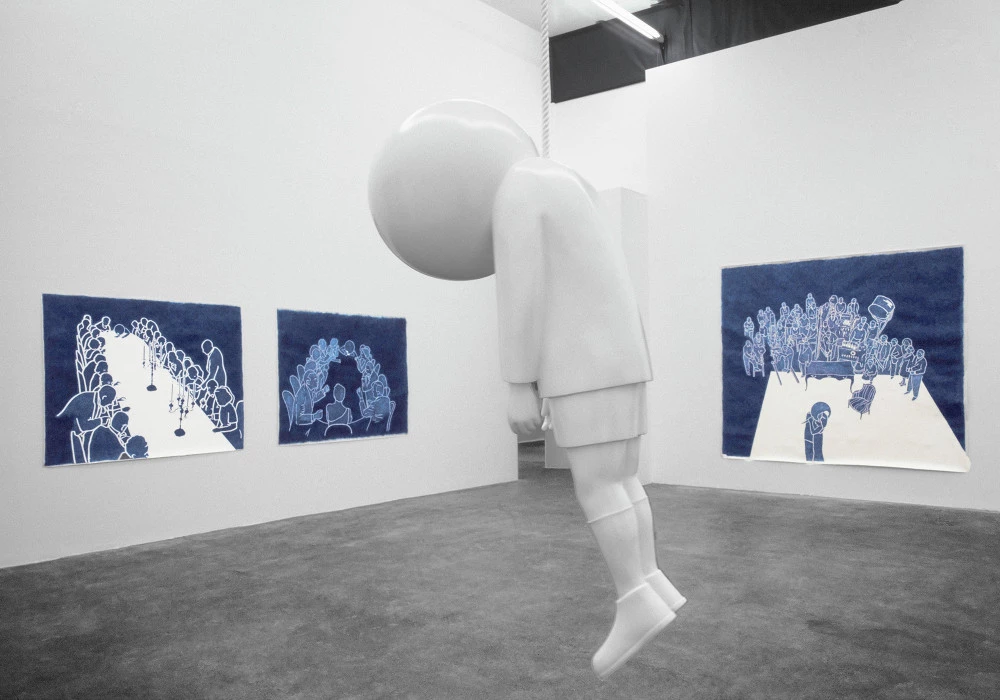 Vue de l’exposition « Coconutour », Crac Languedoc-Roussillon, Sète, 2003. Aux murs, Patrick Guns, 2003, dessin à l’encre Bic bleu sur papier, « The fading of colour - The left handed suicide attempt », 150 x 200 cm, « The fading of colour - The right handed suicide attempt », 150 x 200 cm et « The fading of colour - The razor’s edge », 250 x 290 cm. Au centre, « The fading of colour - The fading », 2003, sculpture en résine, câble et corde, 170 x 60 x 50 cm, co-production Crac Languedoc-Roussillon. Photo : André Morin.