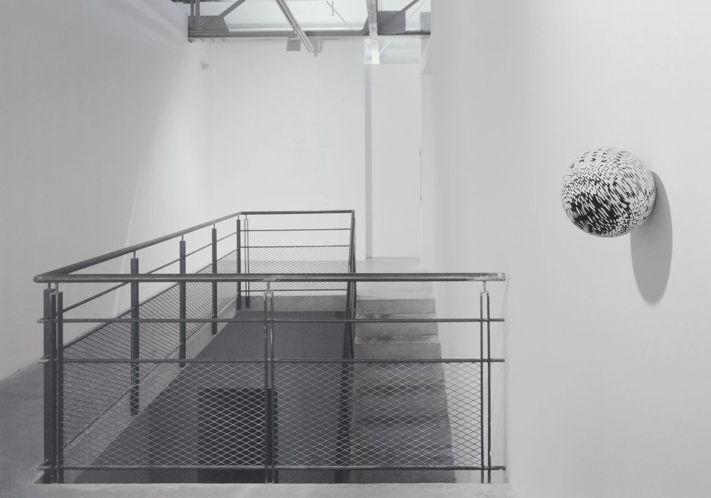Vue de l’exposition « Coconutour », Crac Languedoc-Roussillon, Sète, 2003. Benoît Platéus, « Le mur du son », 2002, papier collé, 120 x 84 cm, courtesy Galerie Baronian Francey, Bruxelles et « Octopus », 2002, feutre sur boule polystyrène, diam. 25 cm, courtesy Galerie Baronian Francey, Bruxelles et Art 3, Valence. Photo : André Morin.