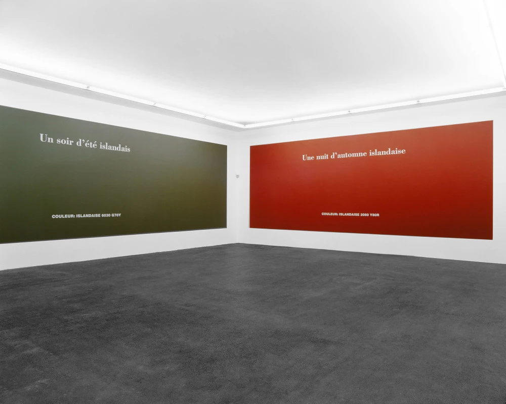Vue de l’exposition « En dehors des cartes – Ut ur kortinu », Crac Languedoc-Roussillon, Sète, 2000. Birgir Andresson, 2000, « Un soir d’été islandais - couleur islandaise 6030 » et « Une nuit d’automne islandaise - couleur islandaise 2080 Y80R ». Photo : François Lagarde.