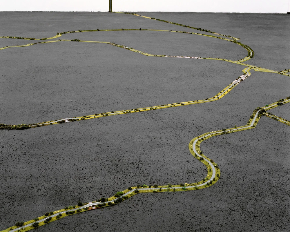 À Sète, Fyrirmind/ Model est constitué de petites routes réalisées à partir d’éléments de maquettes. Elles figurent un dessin linéaire, des lignes coupées et superposées au sol et aux murs de l’espace d’exposition. À l’origine, Katrin s’inspire d’ un dessin en deux dimensions issu d’un diagramme dans le système nerveux du centre de la vision. Phénomène mental de la perception visuelle, sa mise en espace évoque le paysage que l’on traverse mentalement. Le spectateur y est invité. Katrin Sirgurdadottir met en relation les circuits intérieurs du corps, mémoire abstraite de nos émotions avec l’idée symbolique du paysage, témoignage visuel de nos perceptions affectives.