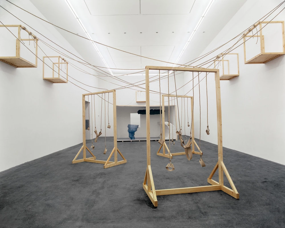 Vue de l’exposition « En dehors des cartes – Ut ur kortinu », Crac Occitanie, Sète, 2000. Philippe Ramette, « Espace à manipuler », 2000 et Jacques Julien et Paul Sztulman, « La chambre aux catastrophes naturelles de petites envergures », 2000. Photo : François Lagarde.