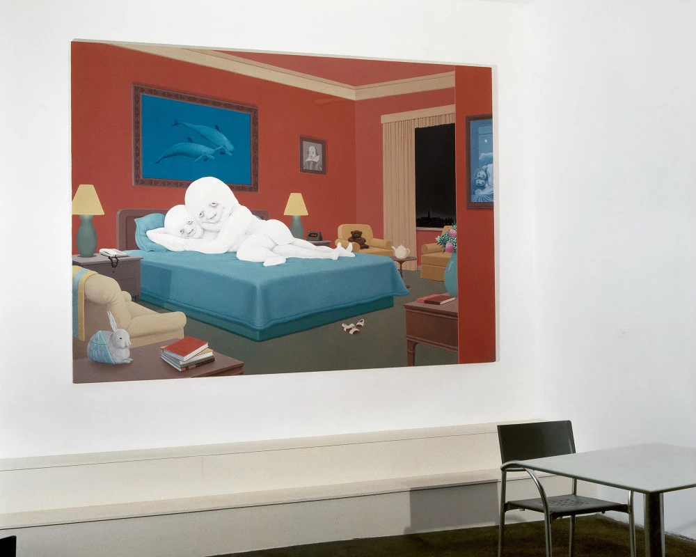 Vue de l’exposition « En dehors des cartes – Ut ur kortinu », Crac Languedoc-Roussillon, Sète, 2000. Hallgrimur Helgasson, « Love & Love - The good bedroom », 1999, acrylique sur toile, 284 x 200 cm. Photo : François Lagarde.