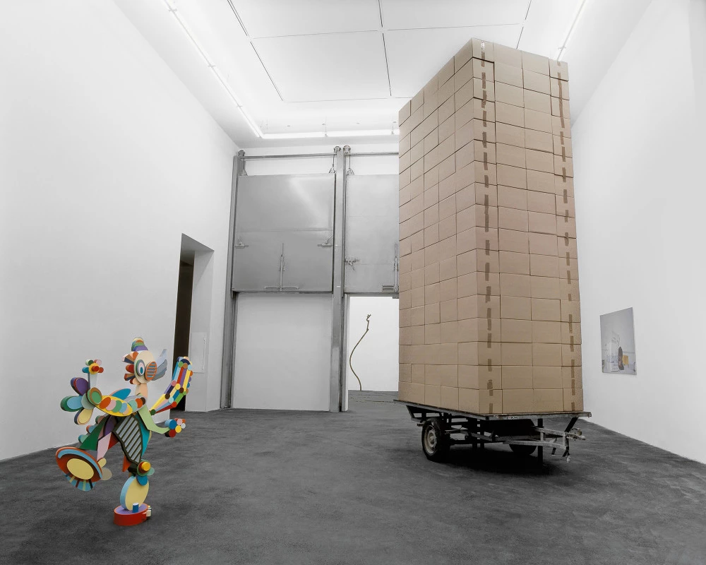 Vue de l’exposition « En dehors des cartes – Ut ur kortinu », Crac Languedoc-Roussillon, Sète, 2000. Hugues Reip, « Fix », 2000, Paul Pouvreau, « Remorque », 2000 et « Beau jeu », 2000, 80 x 120 cm. Photo : François Lagarde.
