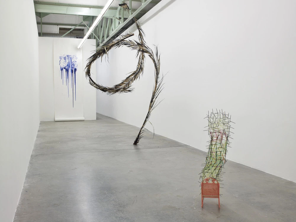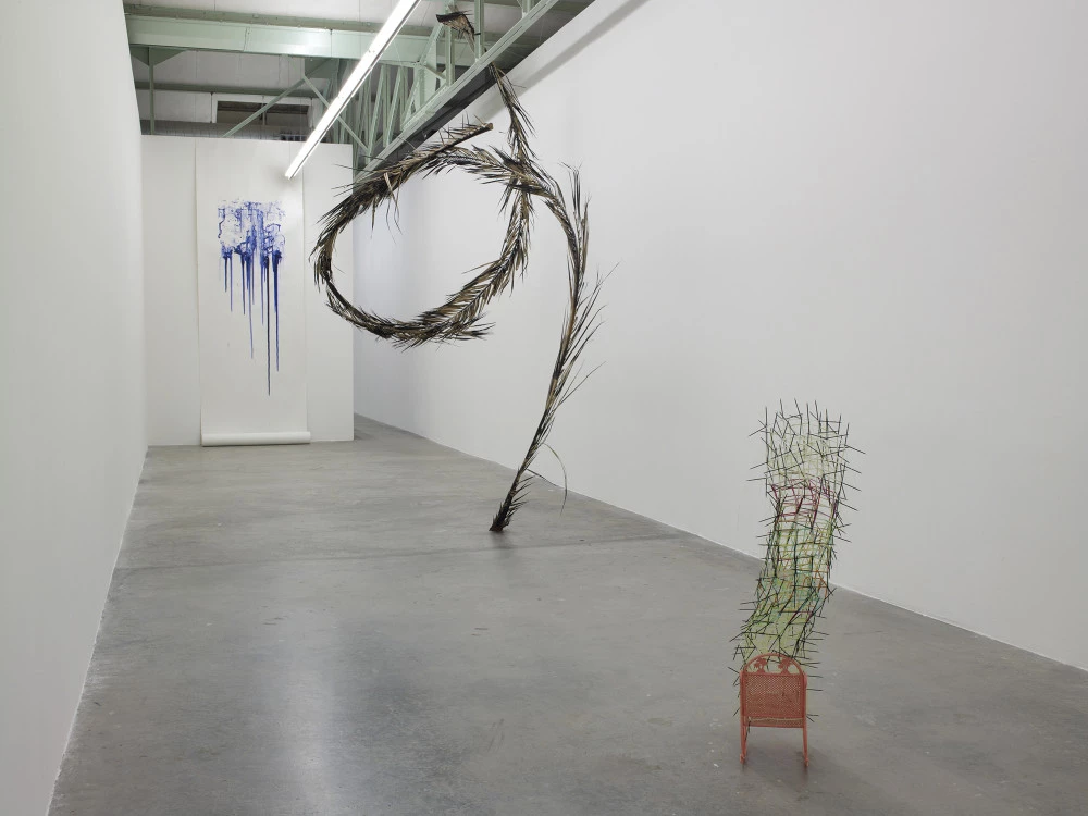 Selon le principe d’un va-et-vient entre la réalité et son extension imaginaire, les installations mettent en perspective des mouvements et des images aperçues dans la vidéo La Playa del Sordo (enroulement de fils de fer barbelés, alignement de fenêtres brisées, tournoiement des feuilles de palmiers…) en écho à la pratique picturale de l’artiste. Au centre de l’espace, une couronne de feuilles de palmiers peinte en noir structure le regard et ouvre à une iconographie multiple. Dans son sillage, les traces noires de l’installation à l’encre et tubes de bic laissent deviner la présence d’une grille disparue. Focale du regard, le treillis modulaire de l’œuvre Étude antisismique (2008) et la composition en cotons-tiges de Mignon (2007), tous deux à l’échelle réduite, laissent s’immiscer la couleur.
