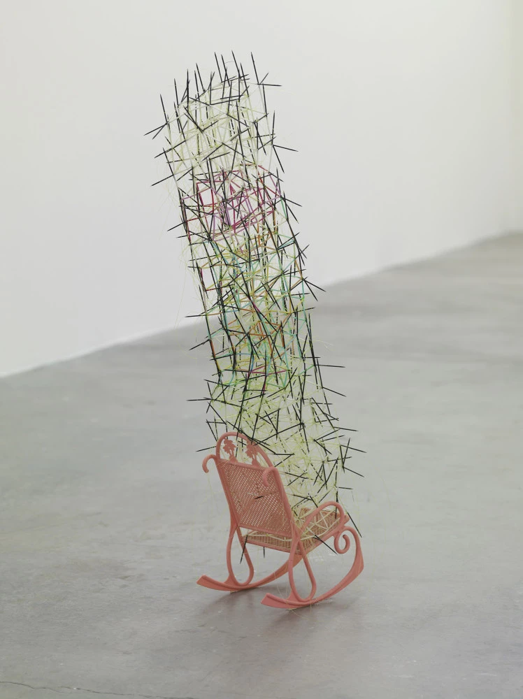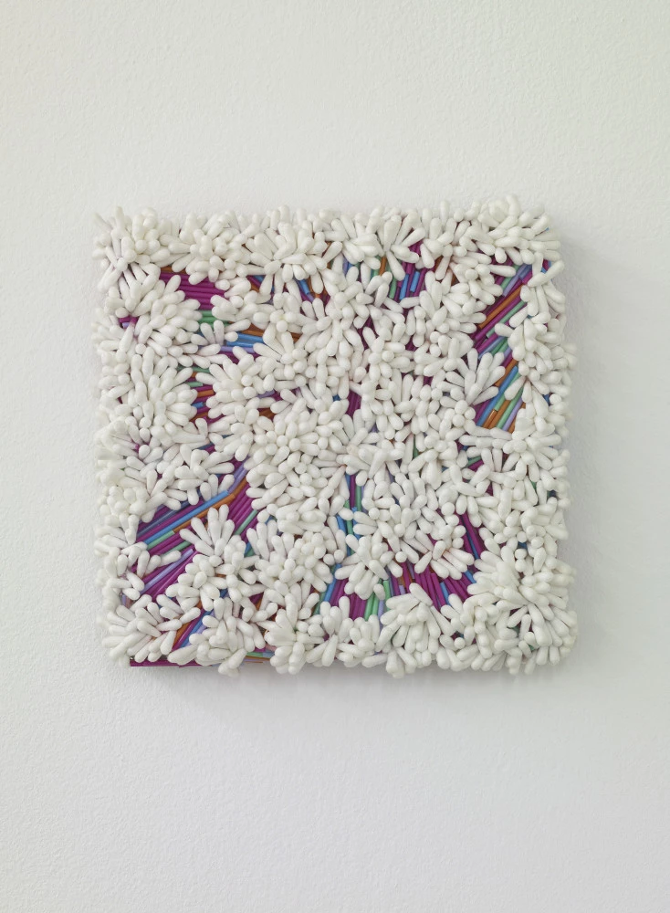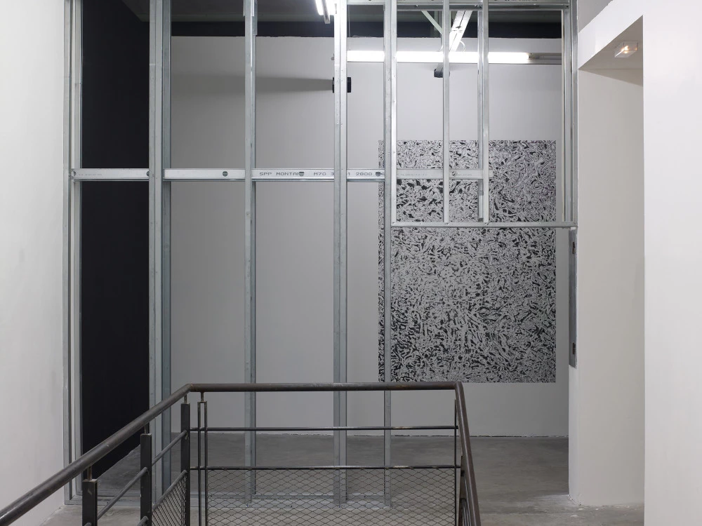 Point de mire introductif à l’exposition, un espace pictural organique est perçu, dès la montée de l’escalier, à travers la matrice analytique qu’est la grille, ici, architecturale. Un “ wall painting ” abstrait, composé d’un grouillement informel, dialogue en contrepoint avec un monochrome noir. À l’opposé, un bas-relief composé de têtes de cotons-tiges dessine un paysage imaginaire. Entre les deux, la surface picturale s’ouvre au hasard de son environnement non pictural. Une ligne de coton rose ouvre une brèche dans l’espace du mur délimité par un monochrome brillant de peinture blanche, transposant le “concepto spatiale” de Lucio Fontana ou le zip de Barnett Newman à l’échelle de l’espace tri-dimensionnel du mur.