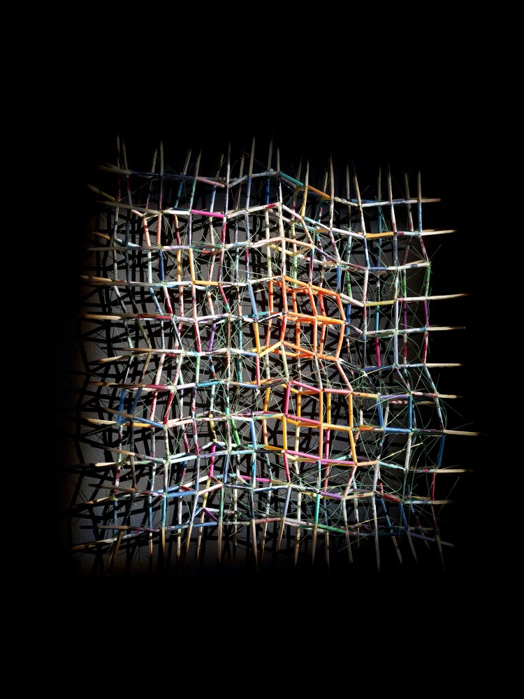 Des bâtonnets assemblés sous forme de grille, aux têtes de cotons-tiges avec lesquelles il rejoue la matérialité du tableau, Olivier Bartoletti interroge la peinture dans sa dimension analytique et organique. Les préoccupations picturales de la ligne et de la couleur, en lien avec l’espace, se prolongent dans les différents supports (vidéo, sculpture, photographie, dessin, installation) qu’il investit. La dimension analytique de l’œuvre héritée des grands courants ayant interrogé la matérialité de la peinture (Art minimal, Supports-Surfaces, Arte povera) est contrebalancée par l’imaginaire teinté d’humour suscité par les œuvres. L’expérience de la promenade se prolonge dans le tissage (trame) des bâtonnets de cotons-tiges, mais aussi des stylos, avec du fil de pêche. Ce geste long et répétitif inscrit sa pratique dans la durée.