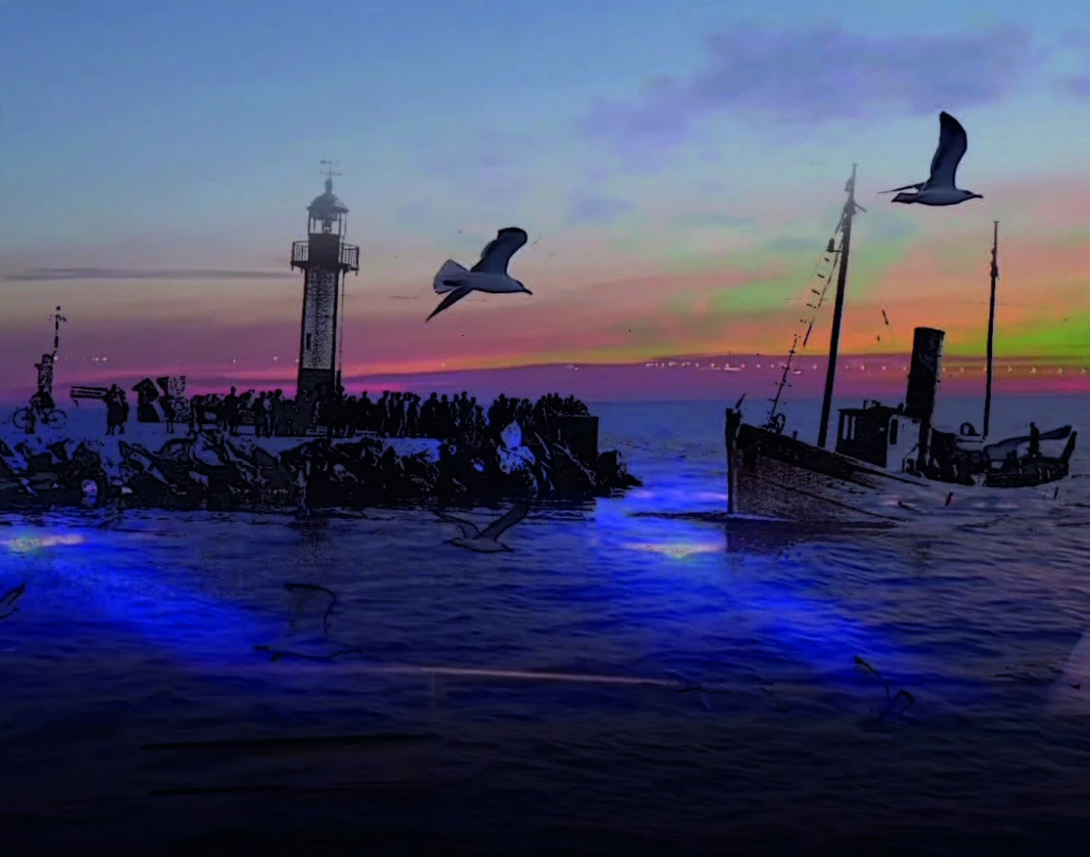 Entre banquet de science-fiction, criée onirique et atmosphère des fonds marins, Louisa Marajo plonge les visiteurs et les visiteuses dans l’espace du rêve. Comme elle l’écrit elle-même au sujet de son court-métrage : « Rêve éveillé, chemin initiatique, ce film est un hommage à ce rapport singulier à la mer-nature aimée à qui nous devons tout, un hommage à la passion de la pêche, ce monde menacé aujourd’hui par ce changement d’époque que nous vivons. Quel chemin prendre ensemble, afin de ne pas devenir hors-sol et tenter de rester connecté.e.s et relié.e.s à cet élément primordial, nourricier et essentiel, ce fragment de nous-même qu’incarne la mer, espace magique irremplaçable (…). Quel chemin prendrons-nous ensemble ? »