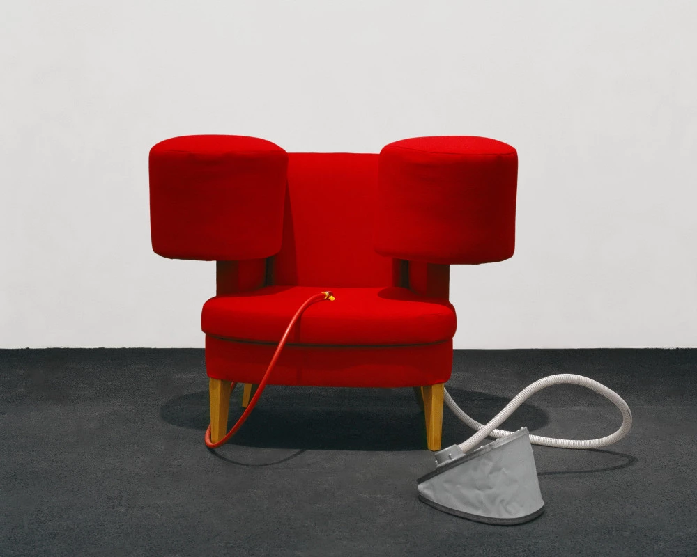 Vue de l’exposition « Légende », Crac Occitanie à Sète, 1997. Wendy Jacob, « Squeeze Chair (red wool) », 1997, fauteuil et système de gonflage. Production Villa Saint Clair, Sète, CRAC Languedoc-Roussillon et FRAC Languedoc-Roussillon. Photo : François Lagarde.