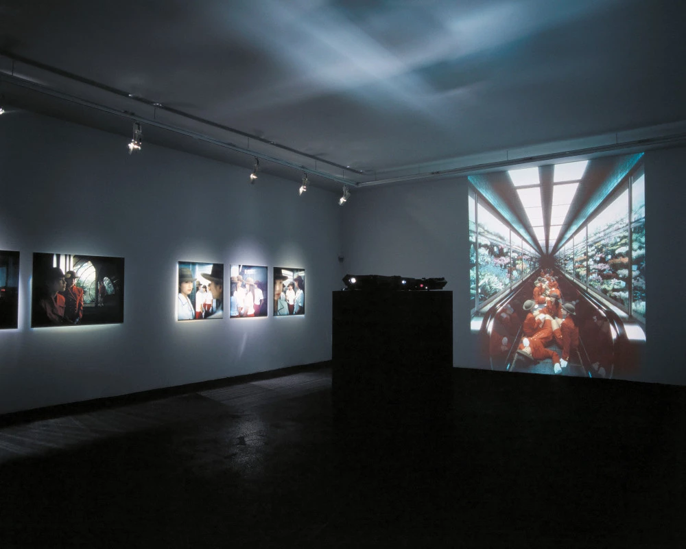 Vue de l’exposition « Légende », Crac Occitanie à Sète, 1997. Mur de gauche : Yanagi Miwa, « A transient world IF, 2F et 3F », 1997, tirages contrecollés sur lexan, 90 x 90 cm. Mur de droite : Yanagi Miwa, « Elevators Girl House I F », 1997, double projection de diapositives. Photo : François Lagarde.