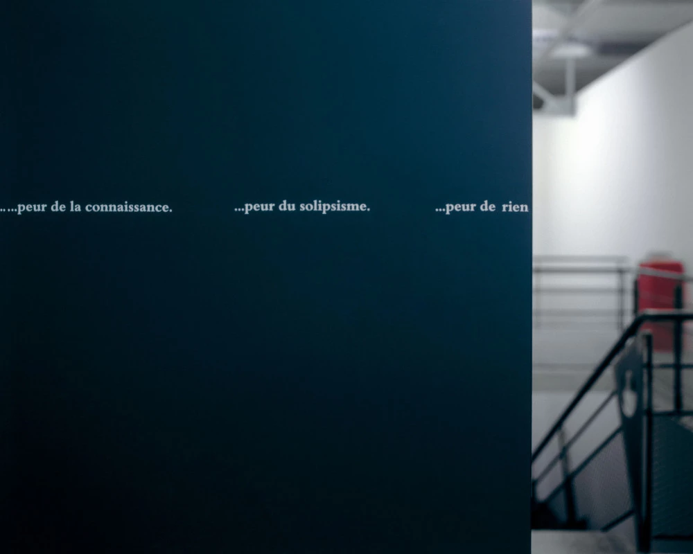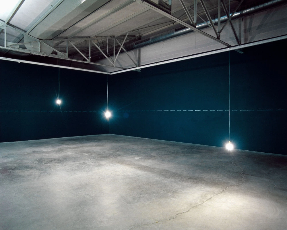 Vue de l’exposition « Légende », Crac Occitanie à Sète, 1997. Douglas Gordon, « From God to nothing », 1997, 150 peurs, 3 ampoules, peinture bleue. Collection FRAC Languedoc-Roussillon. Photo : François Lagarde.