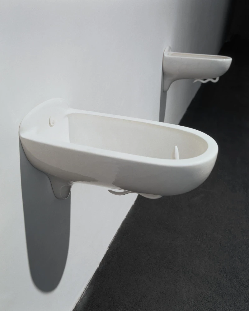 Vue de l’exposition « Légende », Crac Occitanie à Sète, 1997. Marc Le Bris, « Le bidet de la Rosière », 1997, porcelaine émaillée. Photo : François Lagarde.