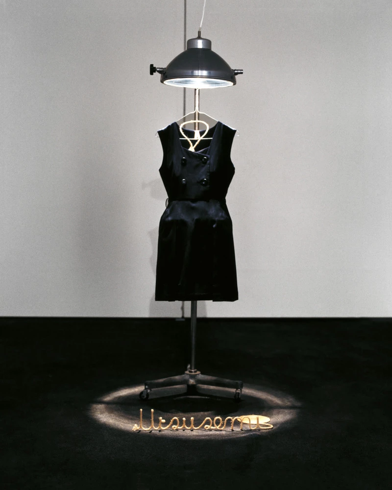 Vue de l’exposition « Légende », Crac Occitanie à Sète, 1997.Marc Le Bris, « Utsusemi (Mue de la cigale) », 1995, robe, système d’éclairage et corde. Photo : François Lagarde.