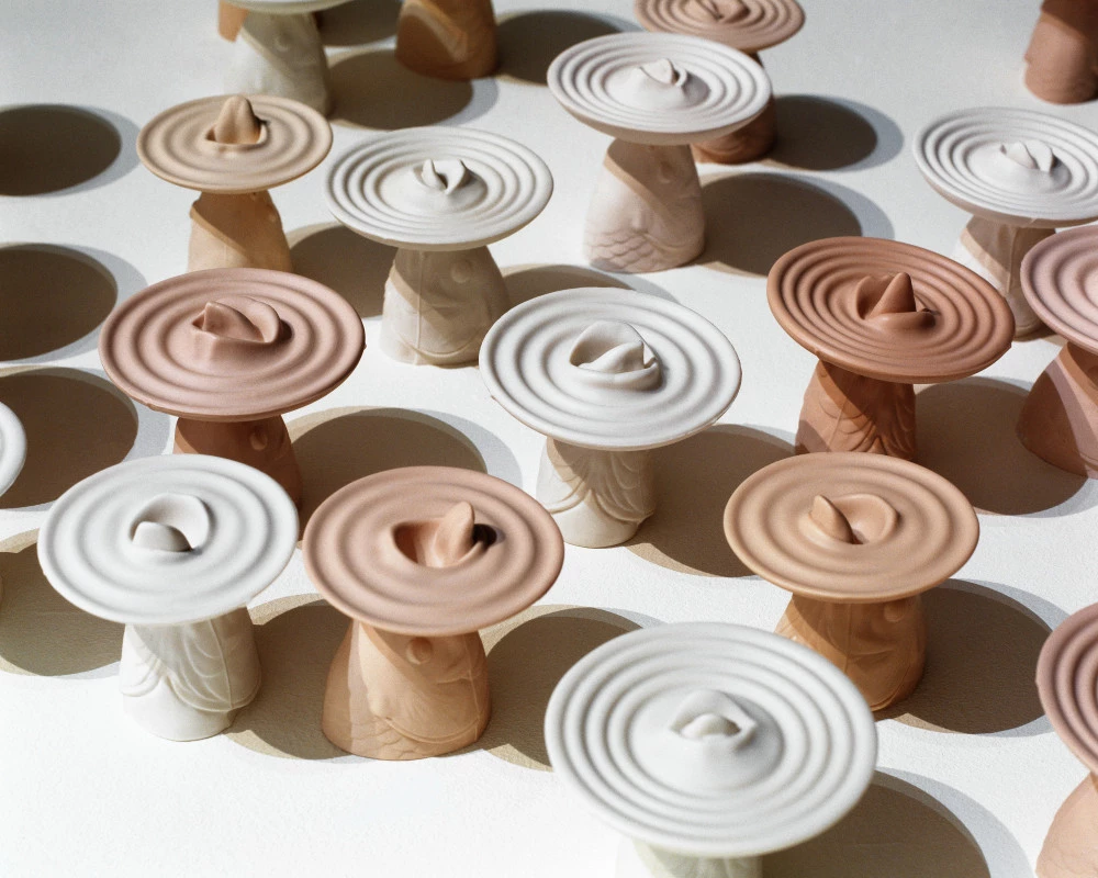 Vue de l’exposition « Légende », Crac Occitanie à Sète, 1997.Marc Le Bris, « Le baiser de la carpe », 1997, porcelaine émaillée. Photo : François Lagarde.