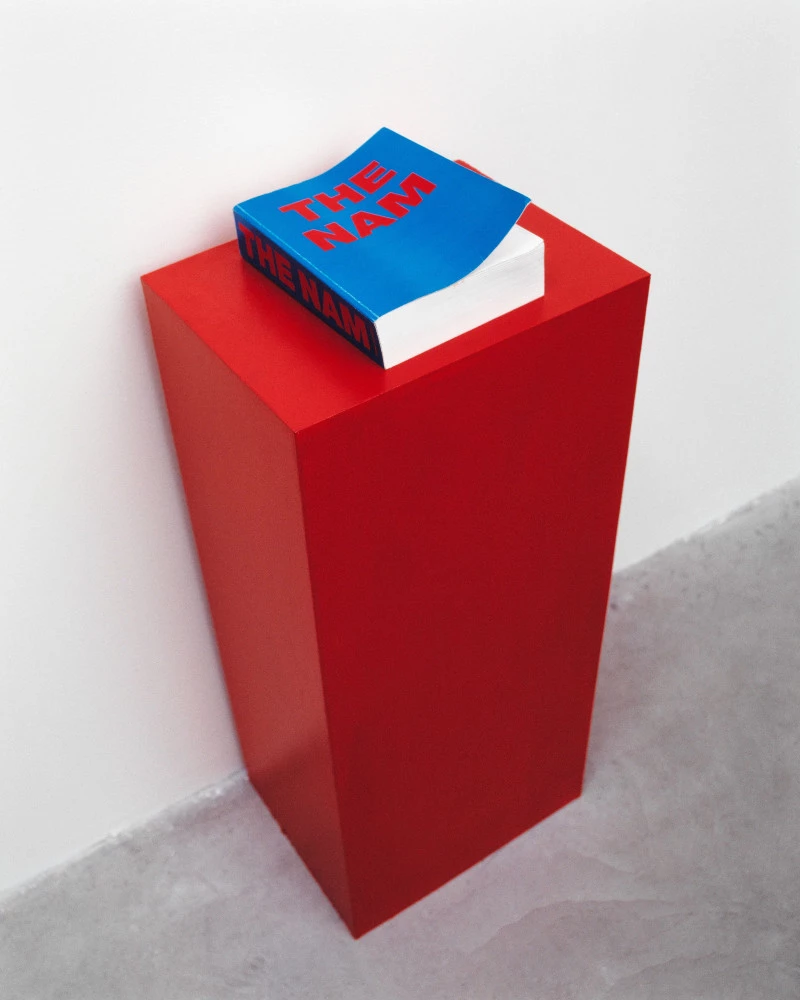 Vue de l’exposition « Légende », Crac Occitanie à Sète, 1997. Fiona Banner, « The Nam », 1997, livre 1000 pages imprimées recto. Collection FRAC Languedoc-Roussillon. Photo : François Lagarde.