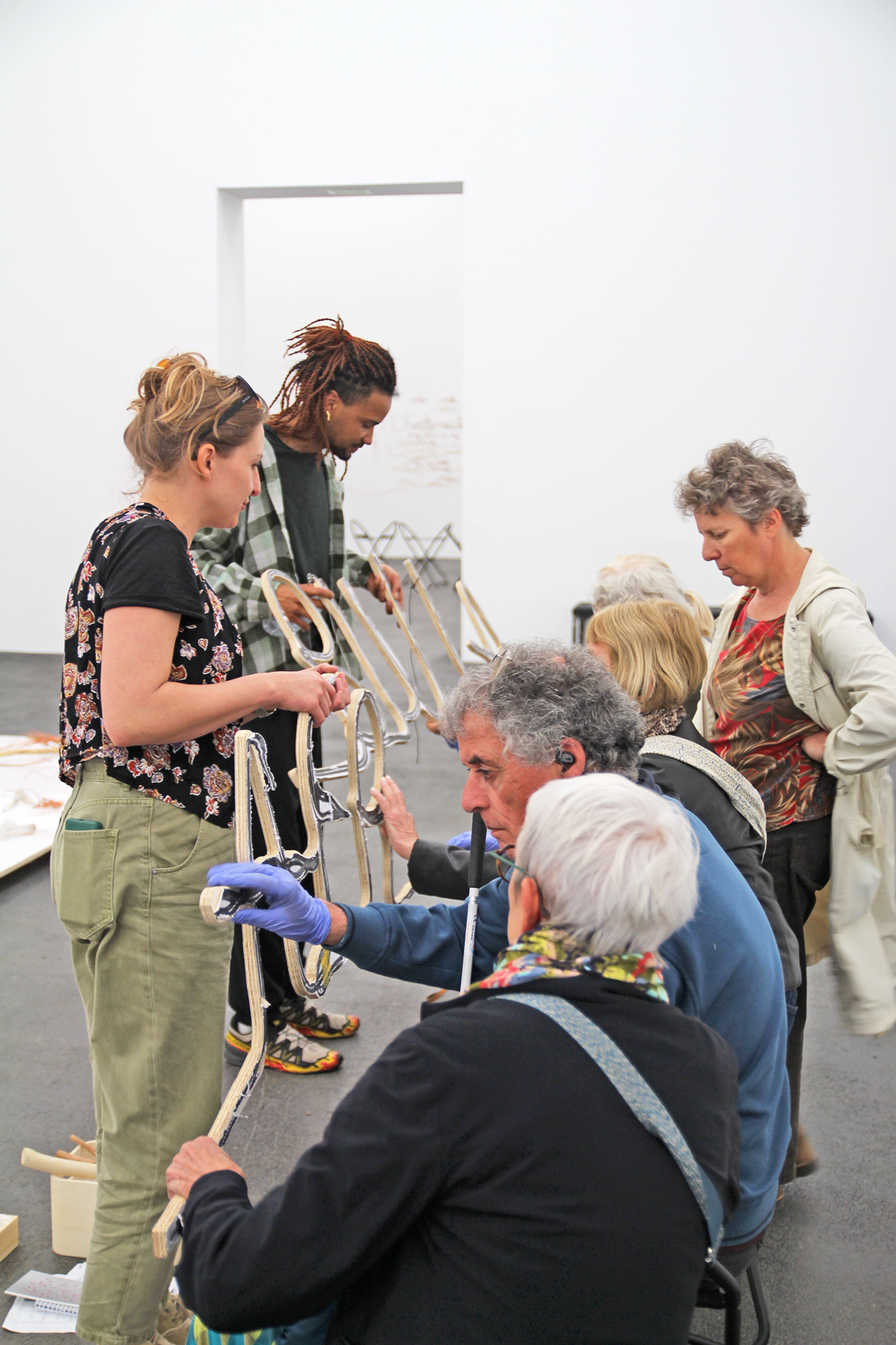 L’accès aux œuvres se fait dans une transmission multiple : la description sensible des œuvres et leur interprétation, le toucher des matériaux de l’exposition et le jeu des corps dans l’espace.