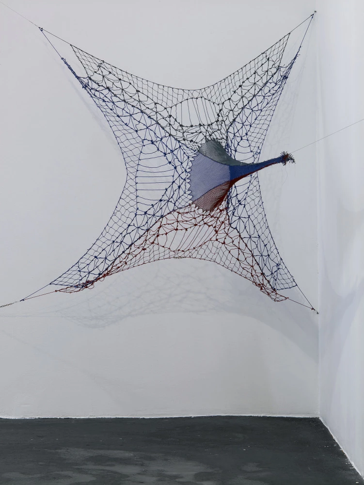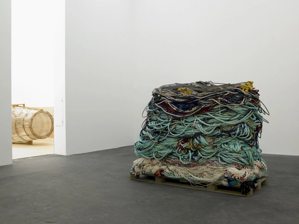 Vue de l’exposition « Dialogue : MamiWata – La tour pélagique », Crac Languedoc-Roussilon à Sète, 2009. Nicolas Floc’h, « La tour pélagique », 2008, nylon, câble, chaîne, 125 x 125 x 300 cm.