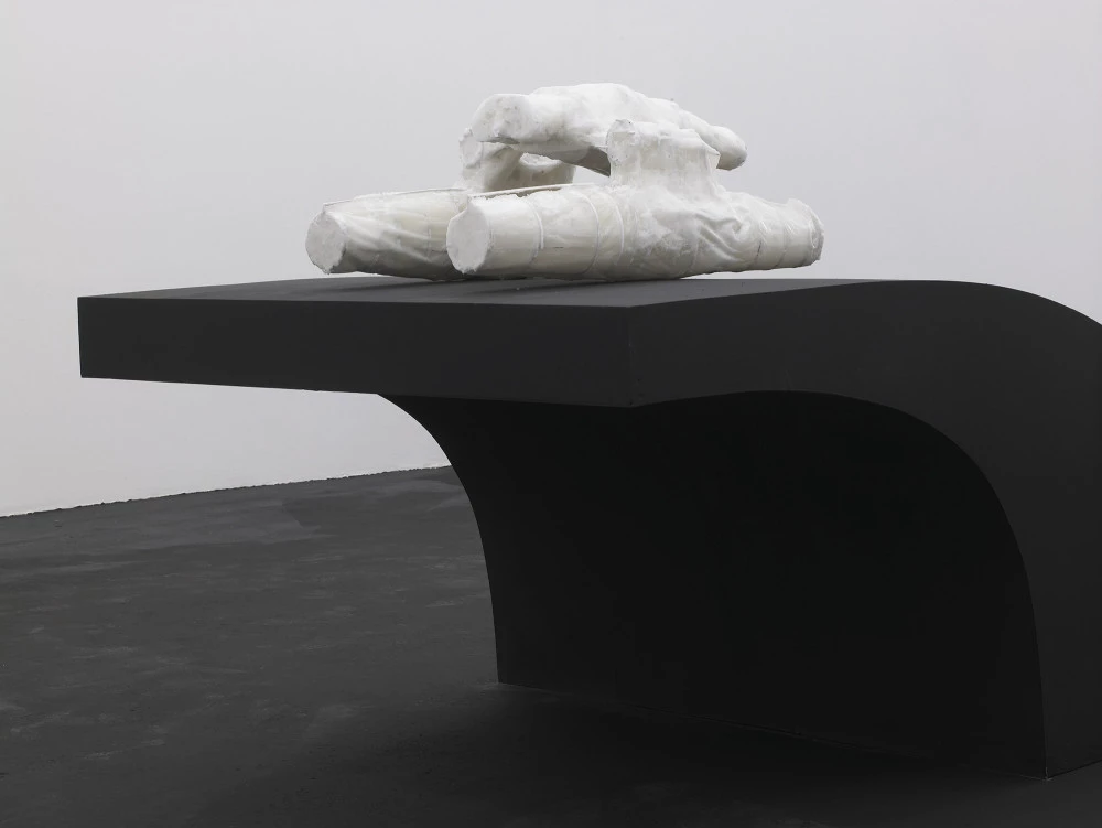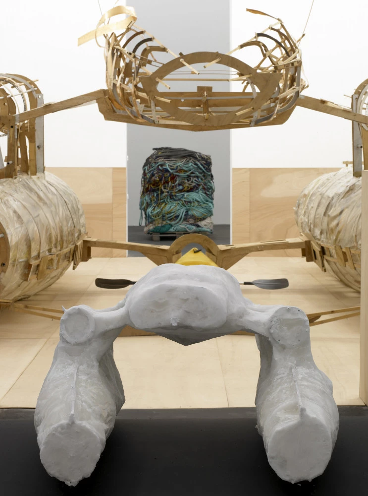 Dans le prolongement, la structure flottante MamiWata L820L650H320, variante de catamaran propulsée par un kayak, envahit l’espace. Présentée sur un sol en contreplaqué, dont le jeu des veines et la résonance modifient l’appréhension sensorielle de l’espace, elle révèle, dans un même mouvement, la force de présence et la fragilité de son architecture. A la poupe du MamiWata L820L650H320, au sommet d’une vague noire, une maquette en cire figure une larve de l’embarcation zoomorphe, à l’allure d’exuvie d’insecte.