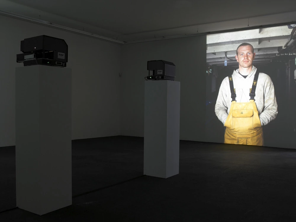 Vue de l’exposition « Dialogue : MamiWata – La tour pélagique », Crac Languedoc-Roussilon à Sète, 2009. Nicolas Floc’h, « La tour pélagique », 2008, 2 projections, 50 et 20 diapositives, collection FRAC Bretagne.