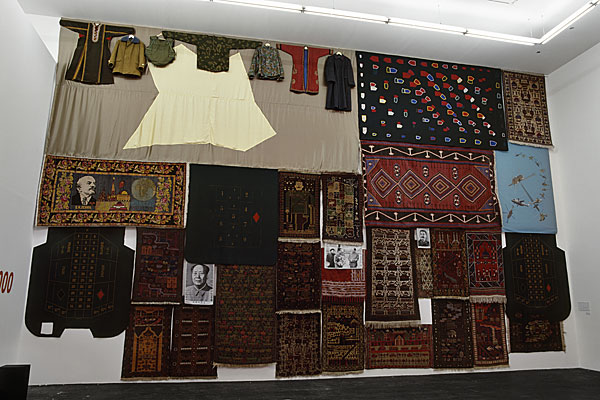 Michel Aubry présente ici, comme dans un souk, une partie de son importante collection de tapis : tapis Afghans, tapis caucasiens des années 30/35, tapis de jeux de boules et de roulettes mais aussi des châles turkmènes, des vêtements de l’armée soviétique, etc.