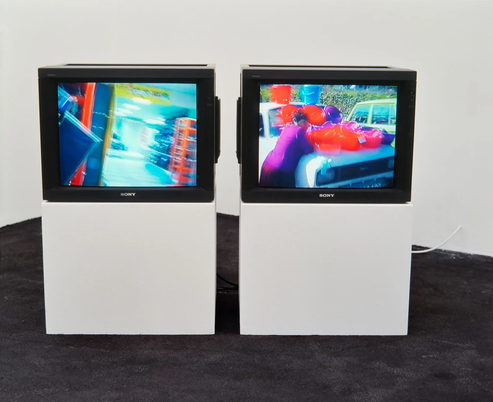 Sylvie Fleury, Between my legs, 1998, vidéo. She-Devils on wheels headquarters, 1997. Collection, Migros Museum, Zurich.