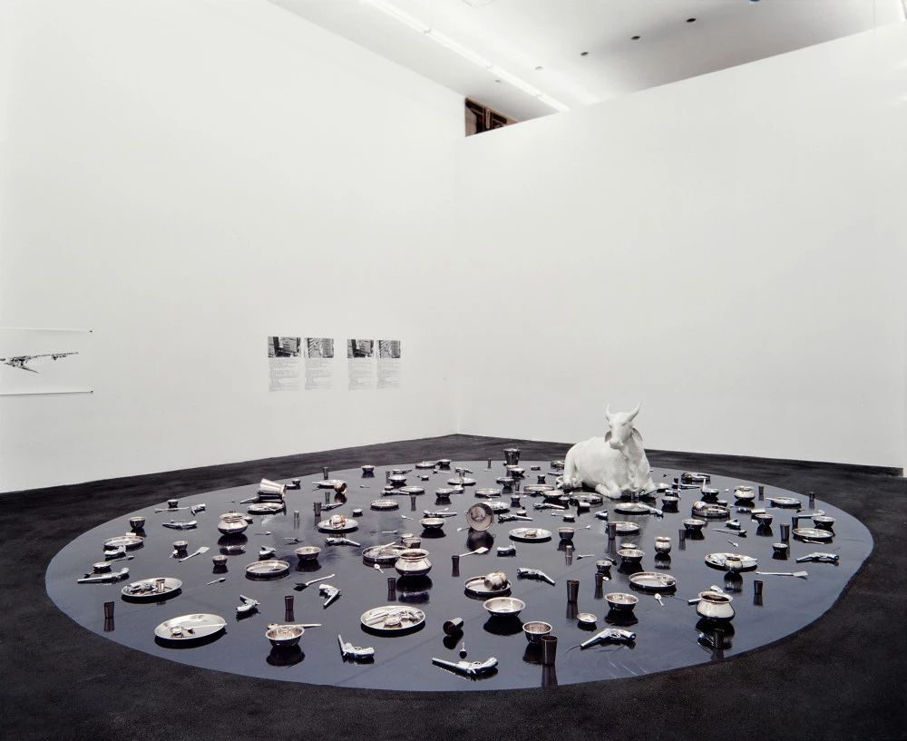 Vue de l’exposition « Négociations », Crac Languedoc-Roussillon, Sète, 2000. Sudobh Gupta, « The Way Home », 2000, résine et métal chromé, 500 cm de diamètre. Photo : François Lagarde.