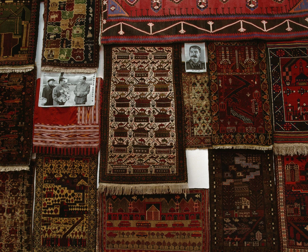 Durant la guerre d’Afghanistan (80/89), une production intensive de tapis s’est développée dans lesquels furent introduits des motifs guerriers, invisibles au premier regard. Une transaction incroyable s’est instaurée entre les soviétiques (soldats sans solde) et les afghans. Dans la tradition des trophées de guerre, les soldats soviétiques troquaient leurs armes contre ces tapis.