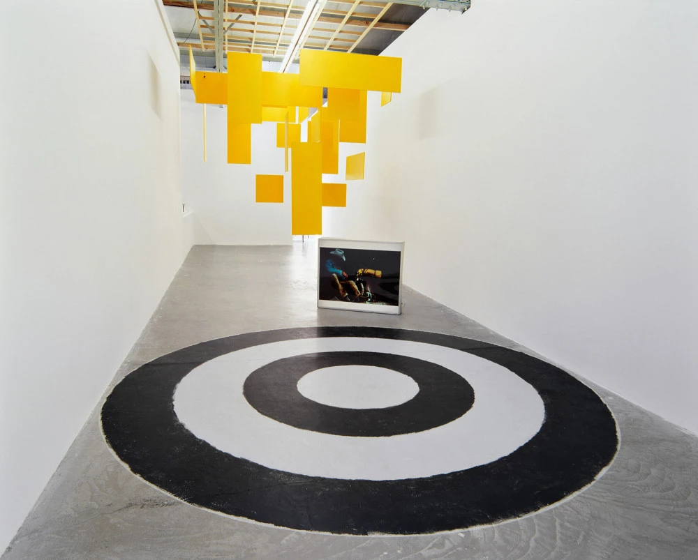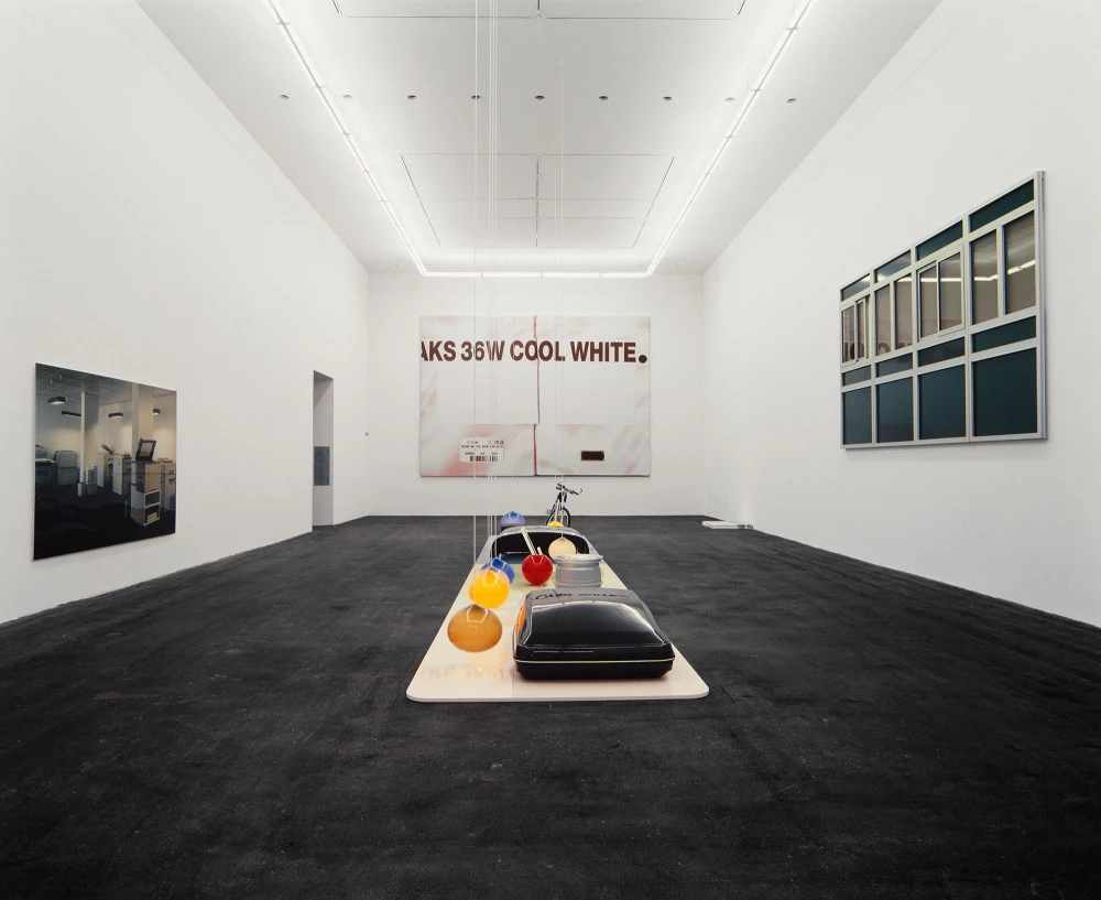 Vue de l’exposition « Négociations », Crac Languedoc-Roussillon, Sète, 2000. Thomas Demand, « Copyshop », 1999, tirage cibachrome, 183,5 x 300 cm, courtesy Galerie Schipper, Krome Berlin, Michel Marejus, « Cool white », 2000, jet d’encre sur bâche, 450 x 640 cm, courtesy Galerie Neugerriemschneider, production Crac Languedoc-Roussillon, Swetlana Heger, « Pacific/Talking about (Quite Normal Luxury) », 1999, divers objets, 7 luminaires, courtesy Galerie Air de Paris, collection FRAC Corse, Plamen Dejanov, « Pacific/Talking about (Quite Normal Luxury) », 1999, divers objets, 7 luminaires, courtesy Galerie Air de Paris, collection FRAC Corse et Bertrand Lavier, « Relief-peinture n°1 », 1988, fenêtre en aluminium, tôle émaillée et plexiglas, collection Musée d’Art Moderne Saint-Etienne. Photo : François Lagarde.