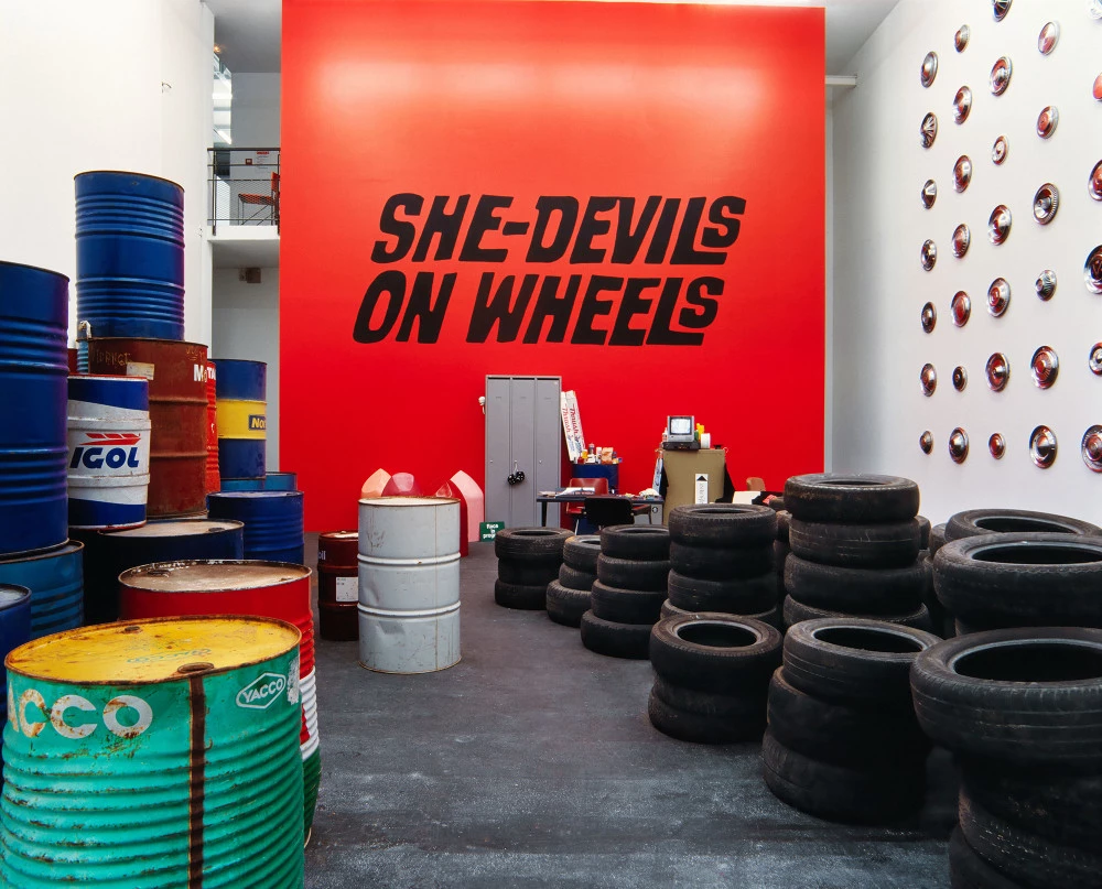 Vue d’un atelier / bureau de garagiste dans lequel se mêlent pneus, bidons, enseignes, bureau, collection d’enjoliveurs de voitures américaines, vidéo, t-shirts noirs et autocollants sérigraphiés "She-Devils on wheels", littéralement : les diablesses sur roues. She-devils on wheels, est un club de femmes réunies autour des mêmes intérêts pour l’automobile américaine. Avec cette installation, Sylvie Fleury évoque à la fois l’atelier d’un garagiste, le siège social d’un fan club et la devanture d’un magasin de matériel automobile de luxe. Elle s’approprie les codes typiquement masculins tout en féminisant l’ensemble du garage par la présence de lipsticks.