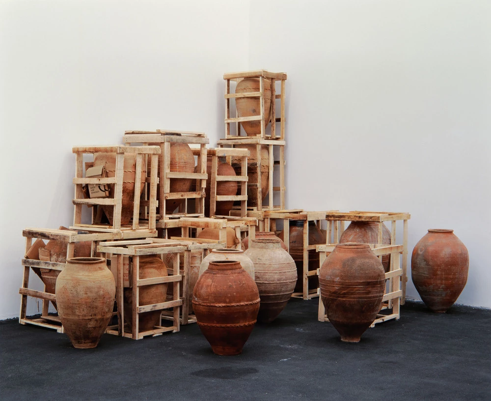Vue de l’exposition « Négociations », Crac Languedoc-Roussillon, Sète, 2000. Wang Du, « Marché aux puces, mise en vente d’informations d’occasion », 1999, 11 sculptures en plâtre sur socle bois, 275 x 900 x 104,5 cm, collection The Pisces Trust. Photo : François Lagarde.