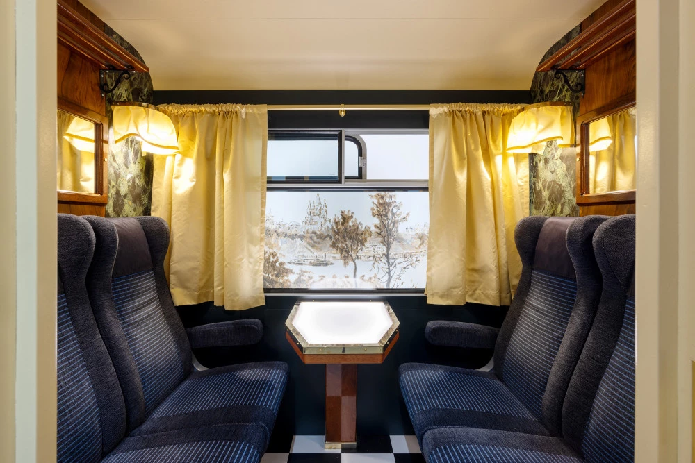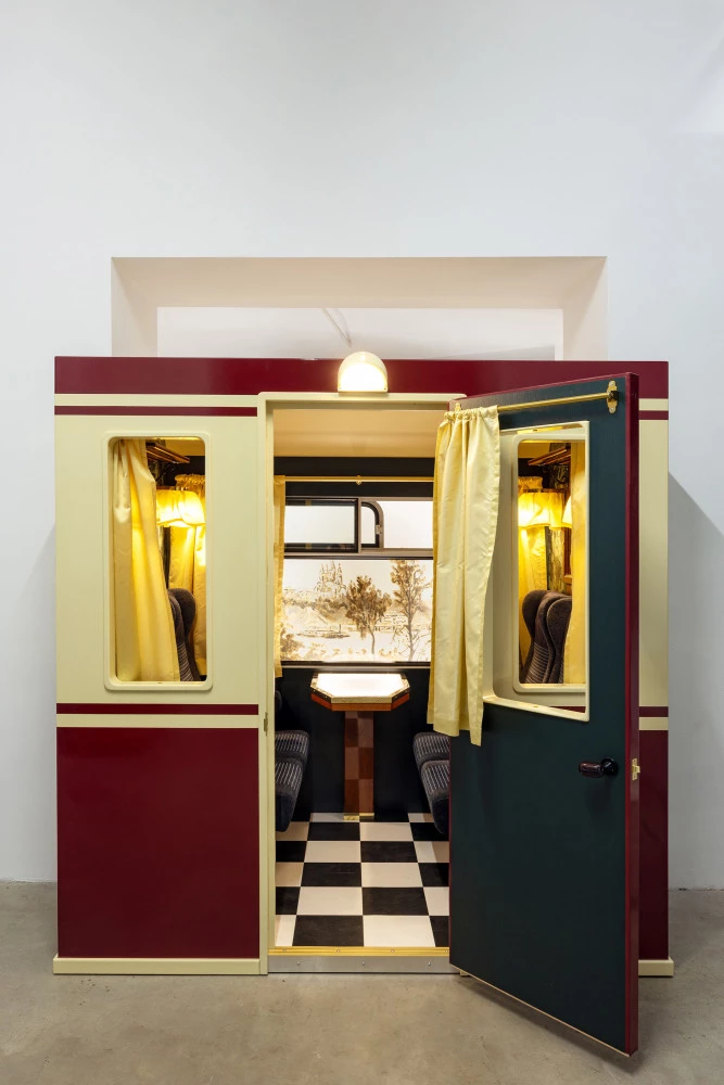 Lucy McKenzie, "Moving Panorama (Trans Siberian)", 2024. Structures en bois et métal, mobilier ferroviaire, verre, textile, moteur, acrylique et huile sur toile. Structure : 700 × 100 × 230 cm, tambour mécanique : 150 cm de diamètre. Courtesy de l’artiste et de la Galerie Buchholz, Cologne. Photo : Lisa Rastl.