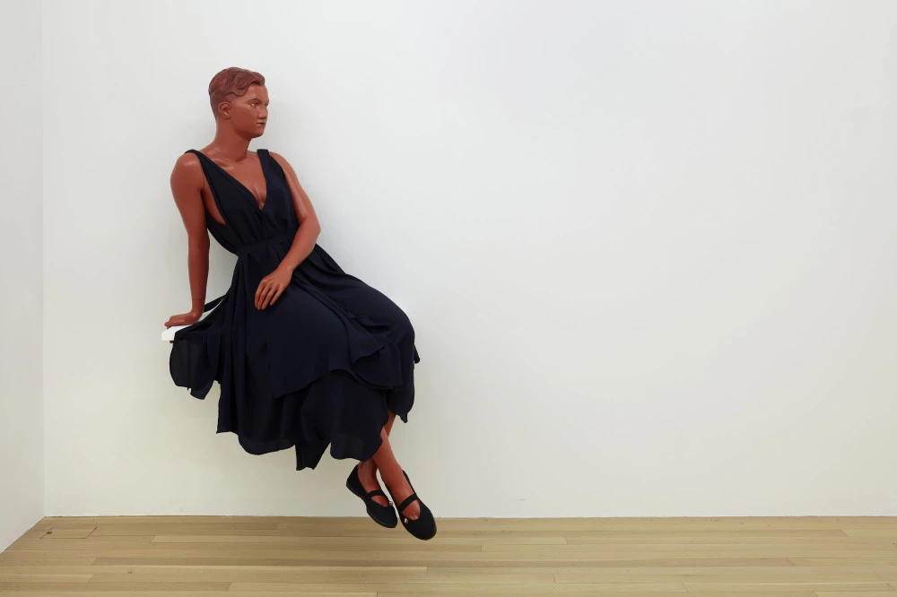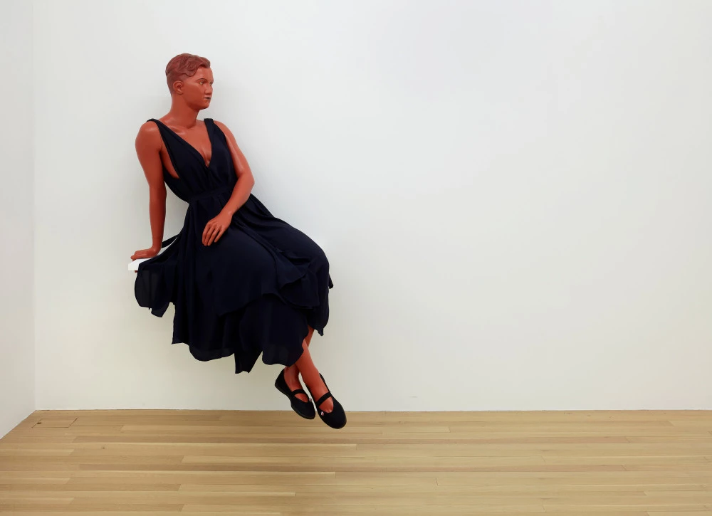 Lucy McKenzie, "Sitting Mannequin (Greek Pottery / Quatre Mouchoirs)", 2020. Mannequin en fibre de verre, peinture acrylique et huile, robe en soie à ceinture, chaussures de sport, étagère, 145 × 85 × 67 cm. Courtesy de l’artiste et de la Galerie Buchholz, Cologne. Photo : Galerie Buchholz.