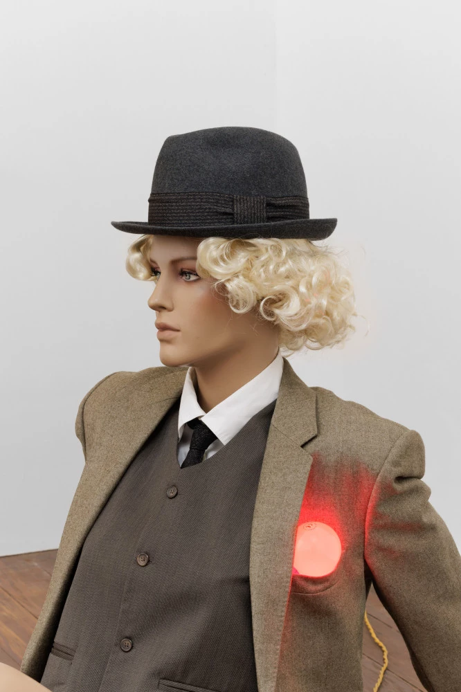 Lucy McKenzie, "Duchamp Mannequin, 1938 (II)", œuvre produite en 2026. Mannequin en fibre de verre, vêtements, perruque et lampe électrique, 160 × 90 × 60 cm. Courtesy de l’artiste et d’un collectionneur privé. Photo : Useful Art Services.