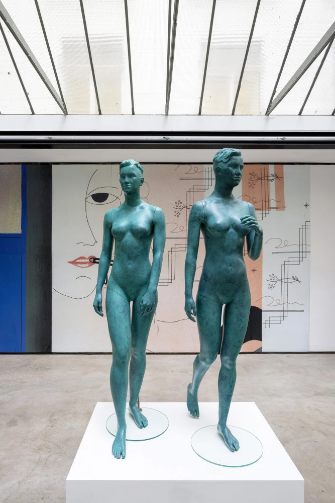 Lucy McKenzie, "Faux Verdigris Statue (Zoya) 1 & 2", 2024. Mannequin en fibre de verre, peinture acrylique et huile, cire, socle, 175 × 49 × 40 cm / 178 × 48 × 69 cm. Courtesy de l’artiste et de la Galerie Buchholz, Cologne. Photo : Lisa Rastl.