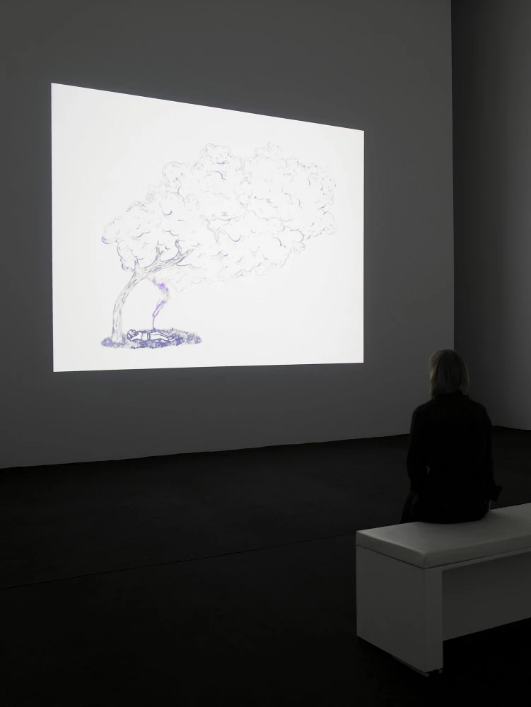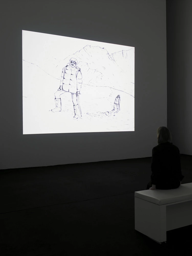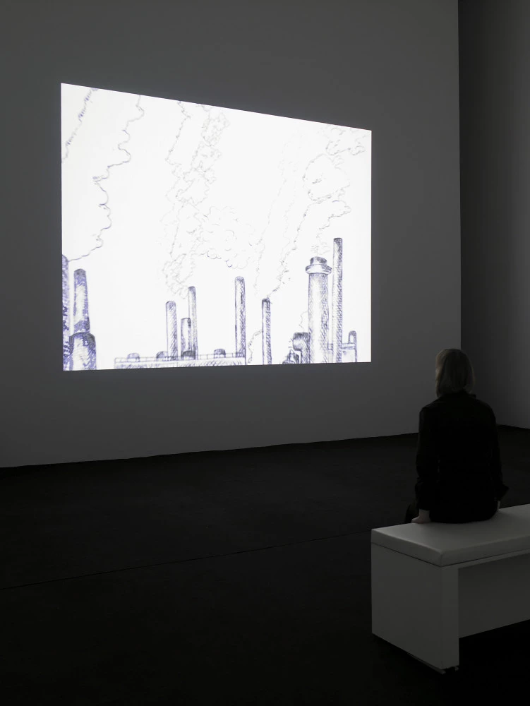 Vue de l’exposition « La bande passante », Fleur Noguera, Crac Languedoc-Roussillon à Sète, 2008. « Smoke », 2008, vidéo, 6 minutes. Réalisation, animation : Nicolas Lichtlé. Composition musicale : Superpeur. Photo : Marc Domage.