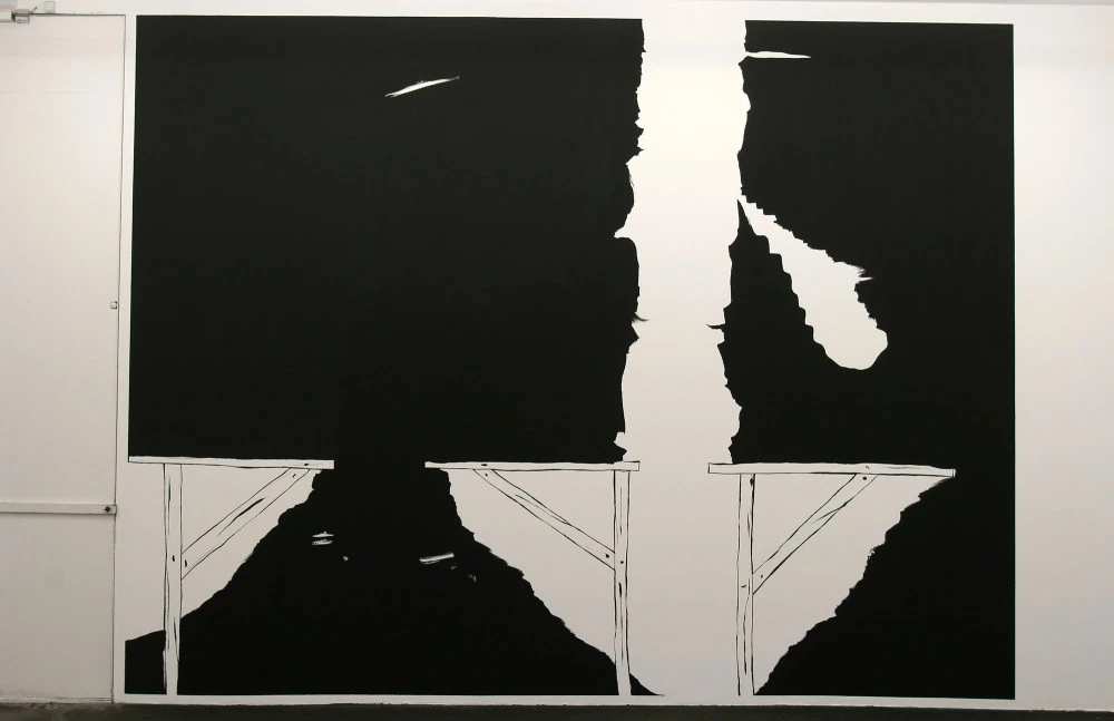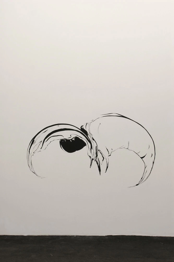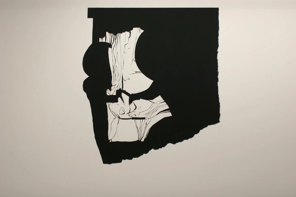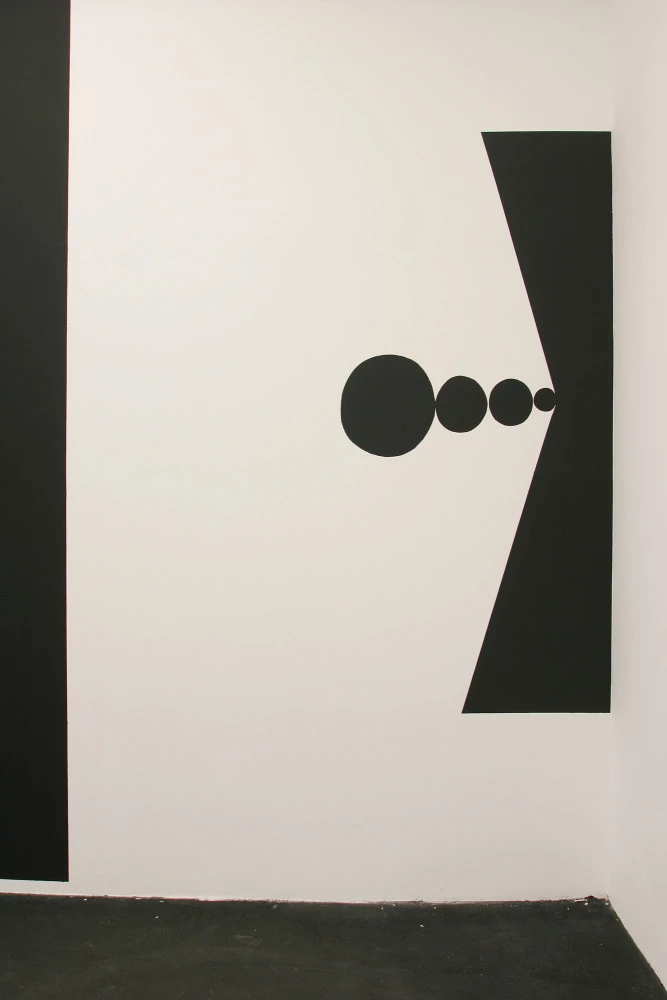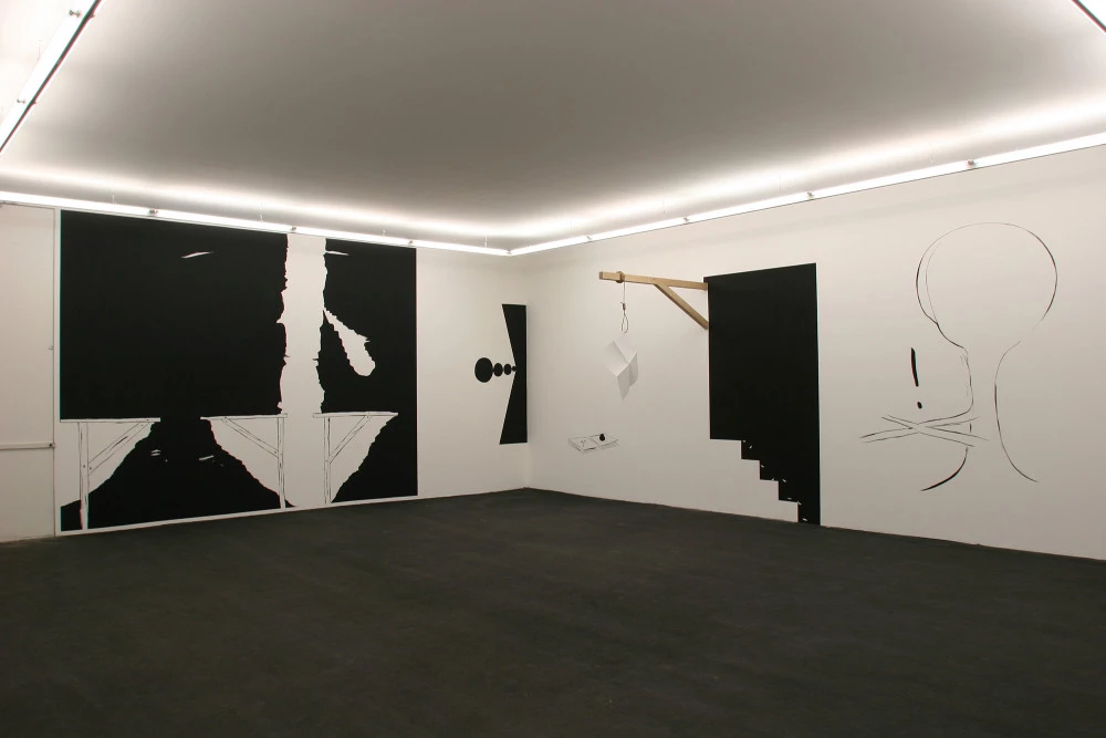 Vue de l’exposition « Trait d’union II - 2ème séquence », 2005, Crac Languedoc-Roussillon, Sète. Olivier Nottellet, « Une feuille blanche se suicide », 2005, installation et wall painting, production Crac Languedoc-Roussillon. Photo : André Morin.