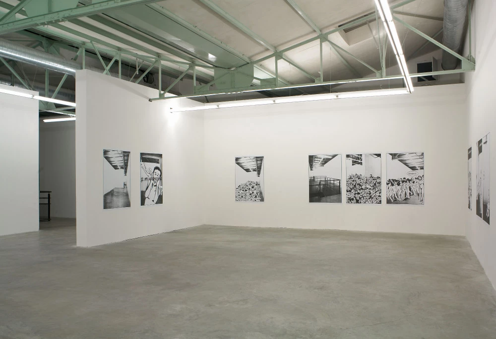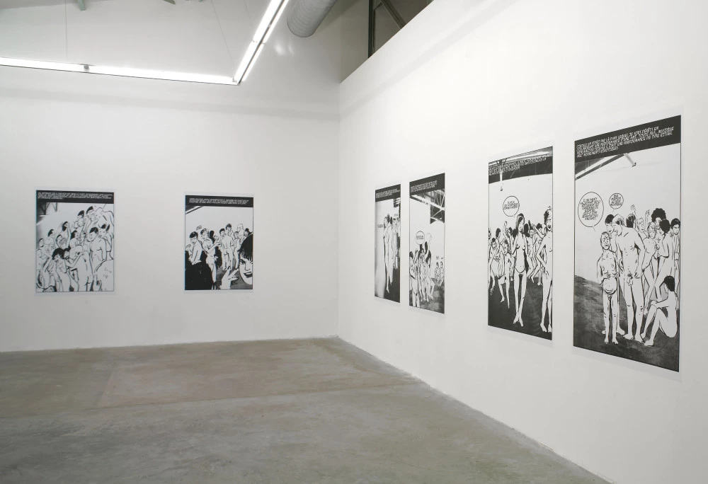 Vue de l’exposition « Trait d’union II – 4ème séquence », 2005, Crac Languedoc-Roussillon, Sète. Francesc Ruiz, « Naked party », 2005. Photo : Olivier Maynard.