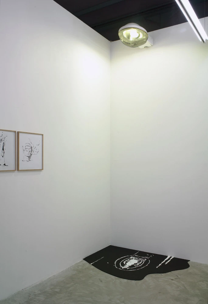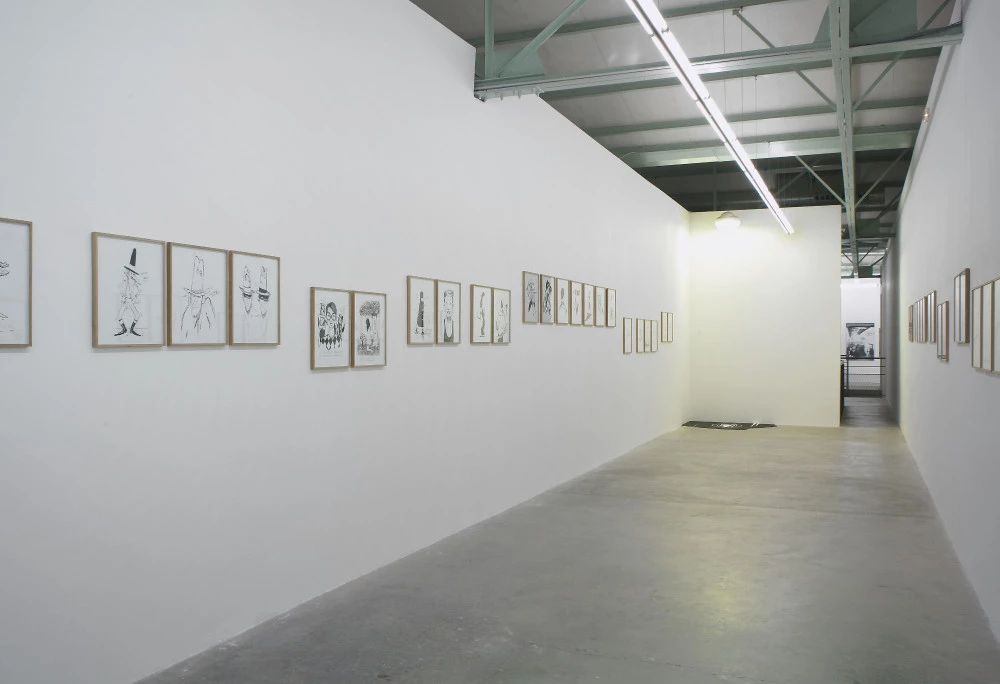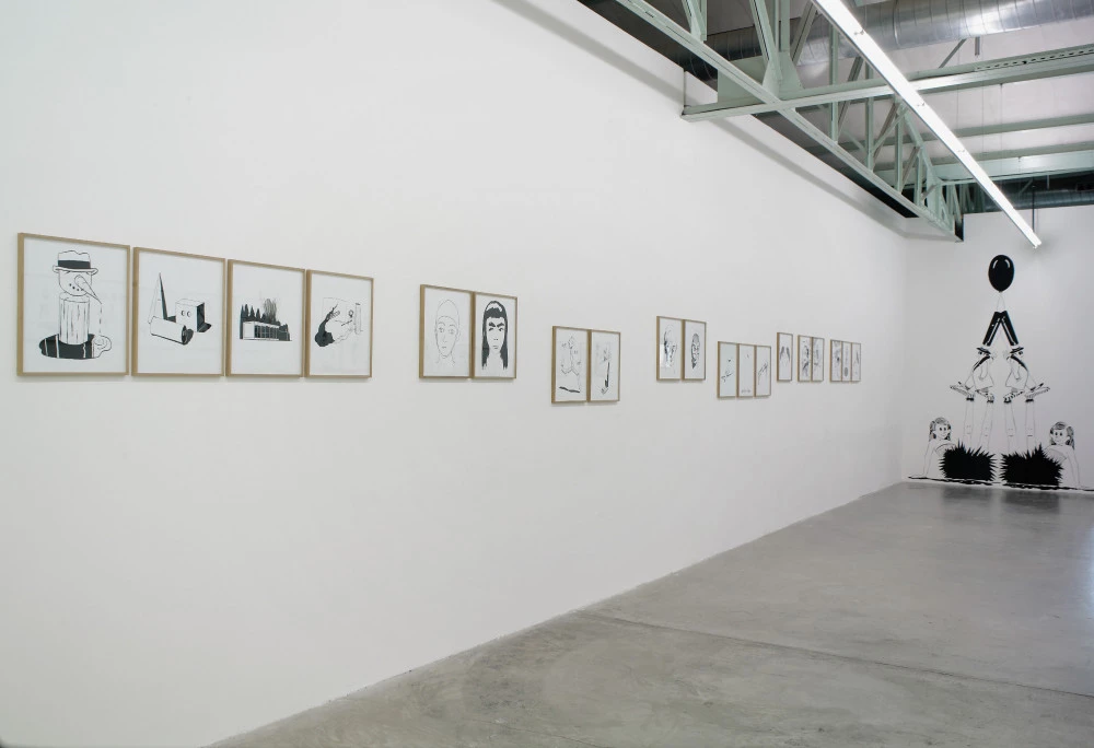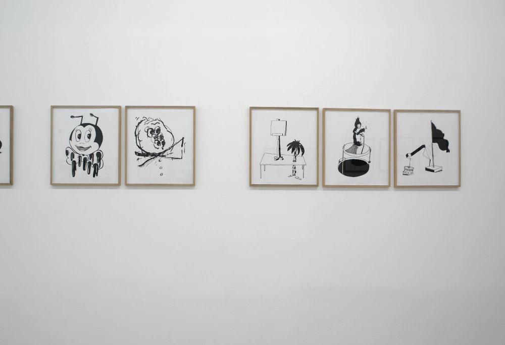 Des dessins encadrés s’alignent, à différentes hauteurs, sur les murs en longueur de la salle. Le regardeur déambule dans un dédale "cartoonesque" de figures, personnages, visages et objets animés, dont la présentation par série rythme la narration.