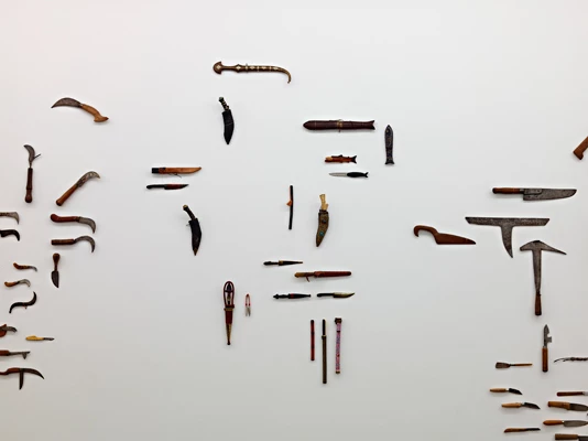 Valentine Schlegel a peint des costumes pour les premiers festivals d’Avignon, elle a réalisé des vases, des sacs, des couverts, des cheminées, des bas-reliefs, fait de son lieu de vie et de travail une œuvre d’art à part entière. L’exposition invite ainsi à une approche horizontale et décloisonnée des territoires convenus de l’art et présente notamment une série de costumes peints, des vases, des maquettes en plâtre de ses cheminées, ainsi que la collection de couteaux de l’artiste.